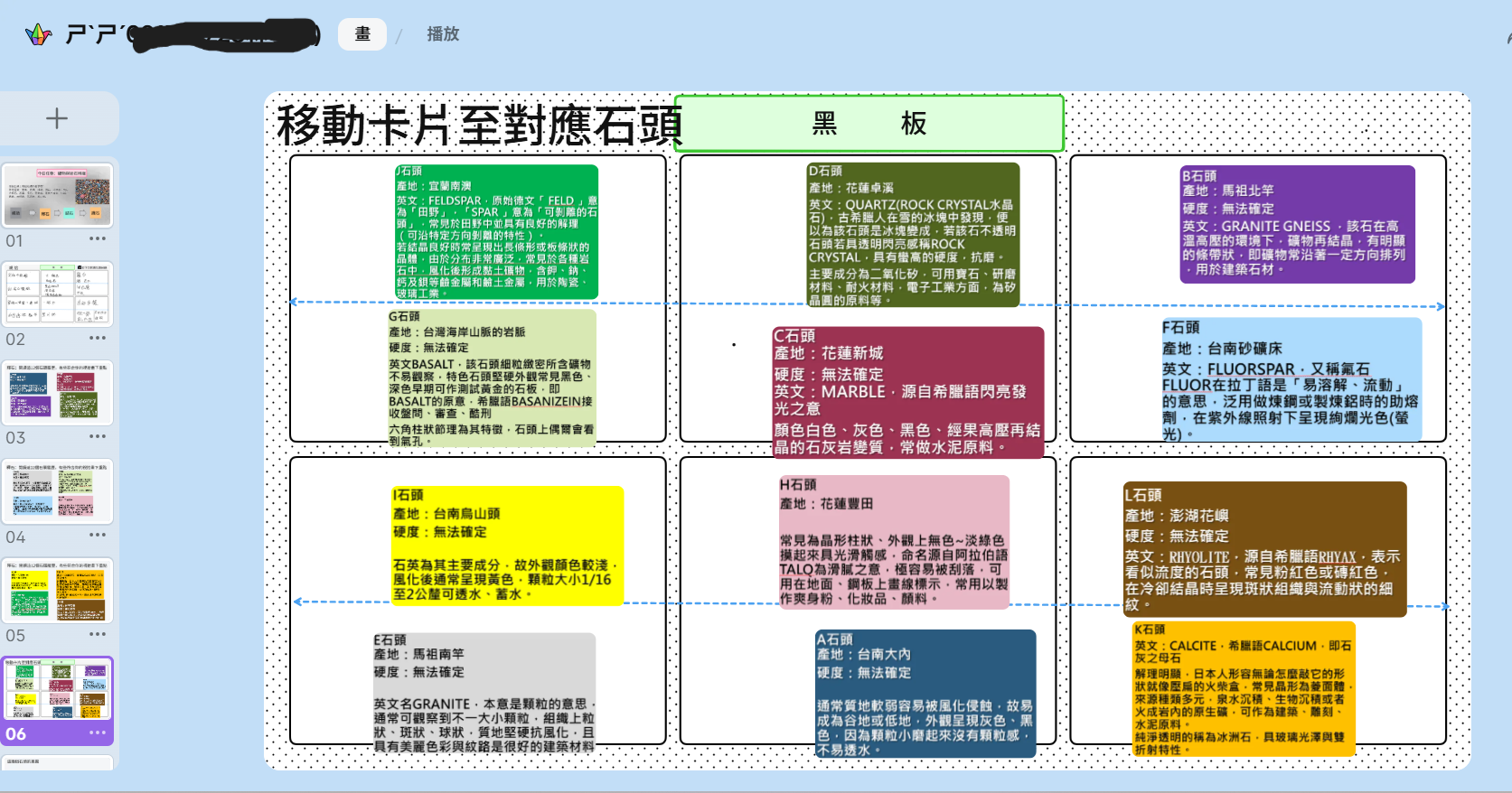 學生們化身為小小地質學家,在小組內分工合作,搜集圖片與資料,並將研究成果即時上傳至Padlet共享白板。從現場照片中可以看到,學生們專注地投入討論,人手一台iPad,將課本上的抽象知識與真實的岩石圖片、特性與生活應用連結起來。Padlet白板上,各組的「數位展品」不斷豐富,不僅有岩石的清晰照片,更有學生們自己整理的重點筆記,例如「花岡岩:岩漿慢慢冷卻,結晶顆粒大」、「石灰岩變質→大理岩」,儼然成為一個班級共創的線上岩石博物館。