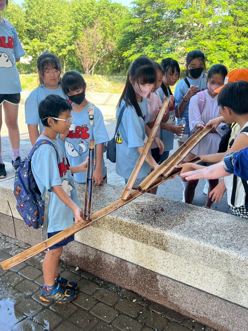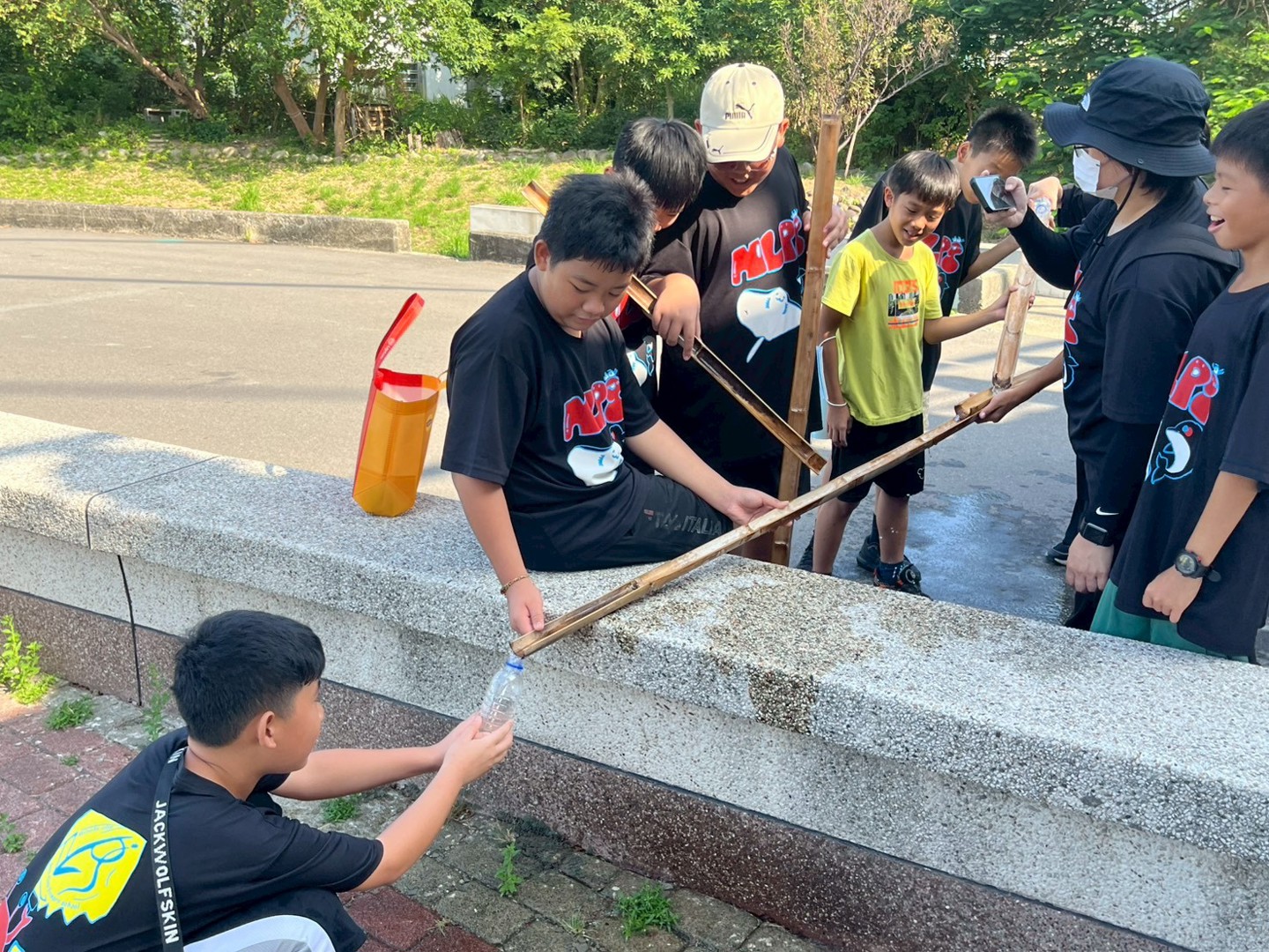 體驗活動三--『#頭前溪水域水文探究與舊港防洪設施』,透過分組,用剖半的竹片傳接水流,探索著頭前溪的流域的水文分布。在炎熱天氣下,不僅做中學,更是玩中學,學習效果加倍。