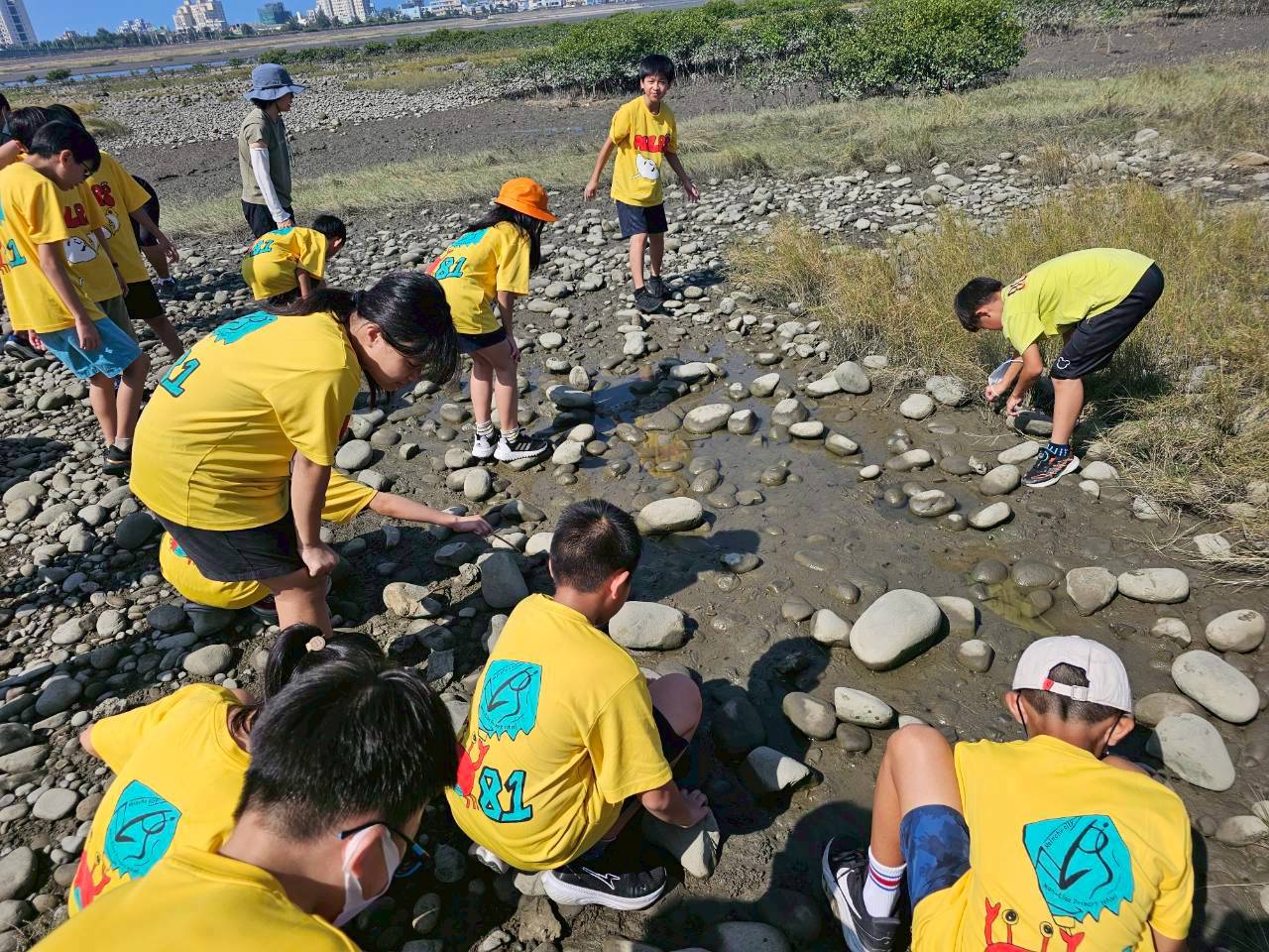 體驗活動一--『#賞夕平台生態探索』,觀察招潮蟹與海茄苳等濕地生態。過程中,潮汐的漲退與招潮蟹的探索,是學生對於舊港最有感也最有趣的部分。