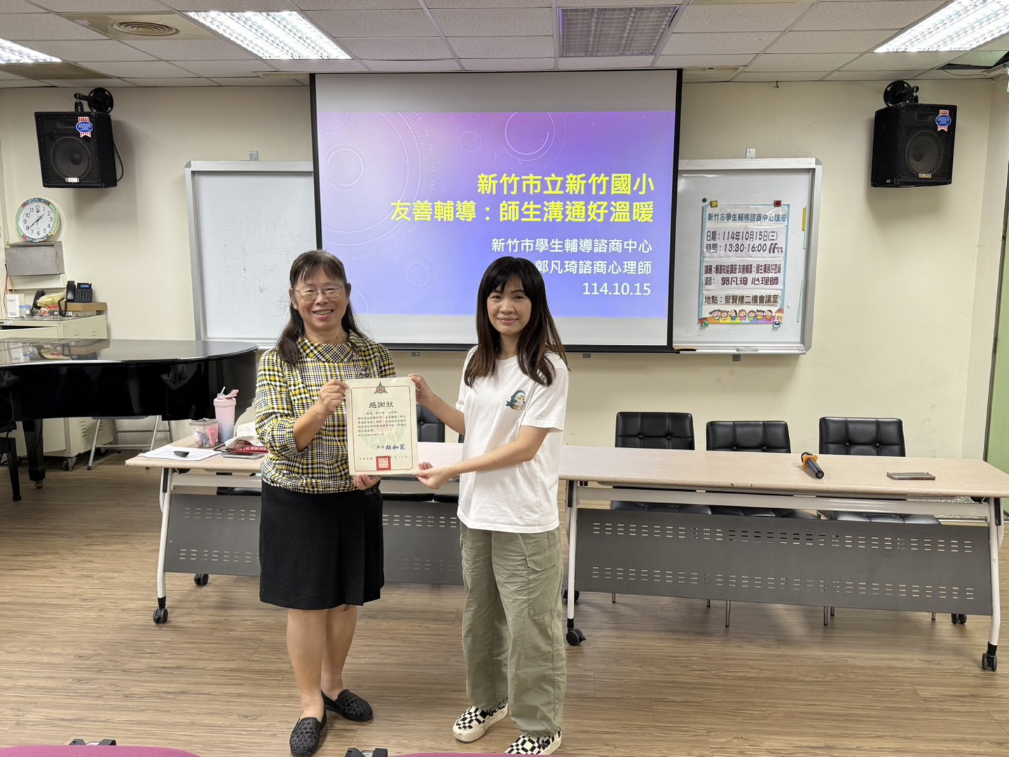 本校於今日下午舉辦「師生溝通好溫暖」研習講座,活動時間為下午1點半至3點半,吸引眾多老師熱情參與。講座開始前,特別邀請胡如茵校長親臨開場,為活動揭開序幕,也期許老師們能在這場研習中收穫滿滿的溝通技巧,讓師生關係更加緊密。