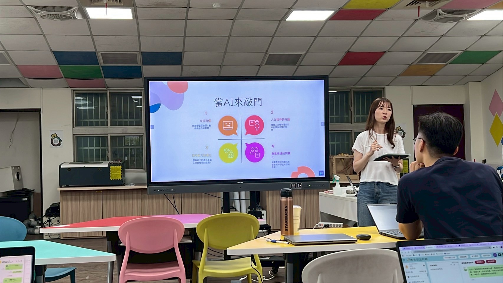 劉育伶老師主張「AI不是敵人,是助教」,分享Suno AI作曲、AI生圖、Podcast腳本等多元應用。她特別強調作文檢討時,讓學生用「驗證式提問」與AI對話,而非直接要求AI代寫,培養學生獨立思考能力。
