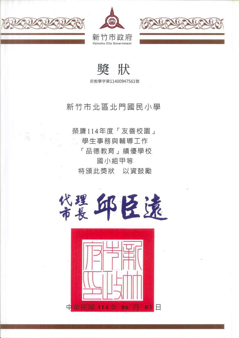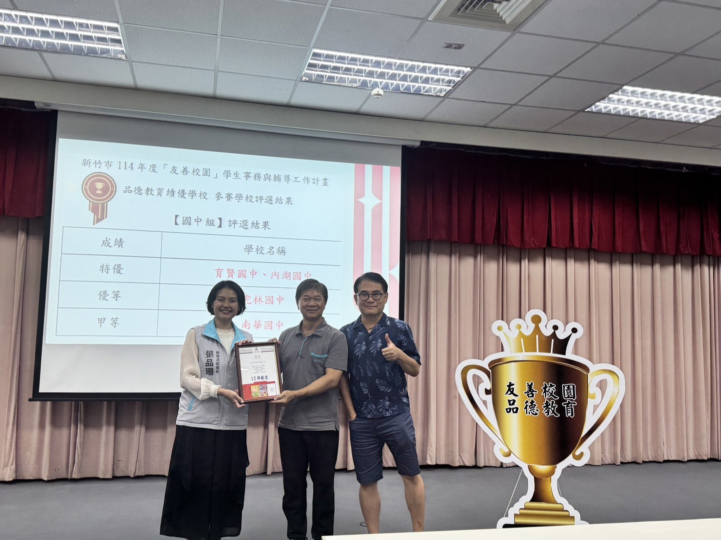 新竹市教育局日前舉辦「品德教育績優學校暨友善校園獎分享與表揚活動」,本校在全市眾多學校中表現亮眼,榮獲 「品德教育績優學校甲等」 及 「傑出輔導人員優等」 的殊榮,展現學校在品德教育推動與學生輔導支持上的卓越成果。