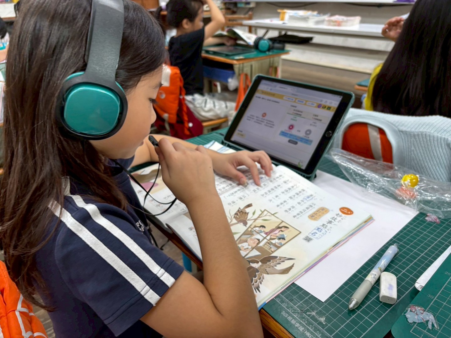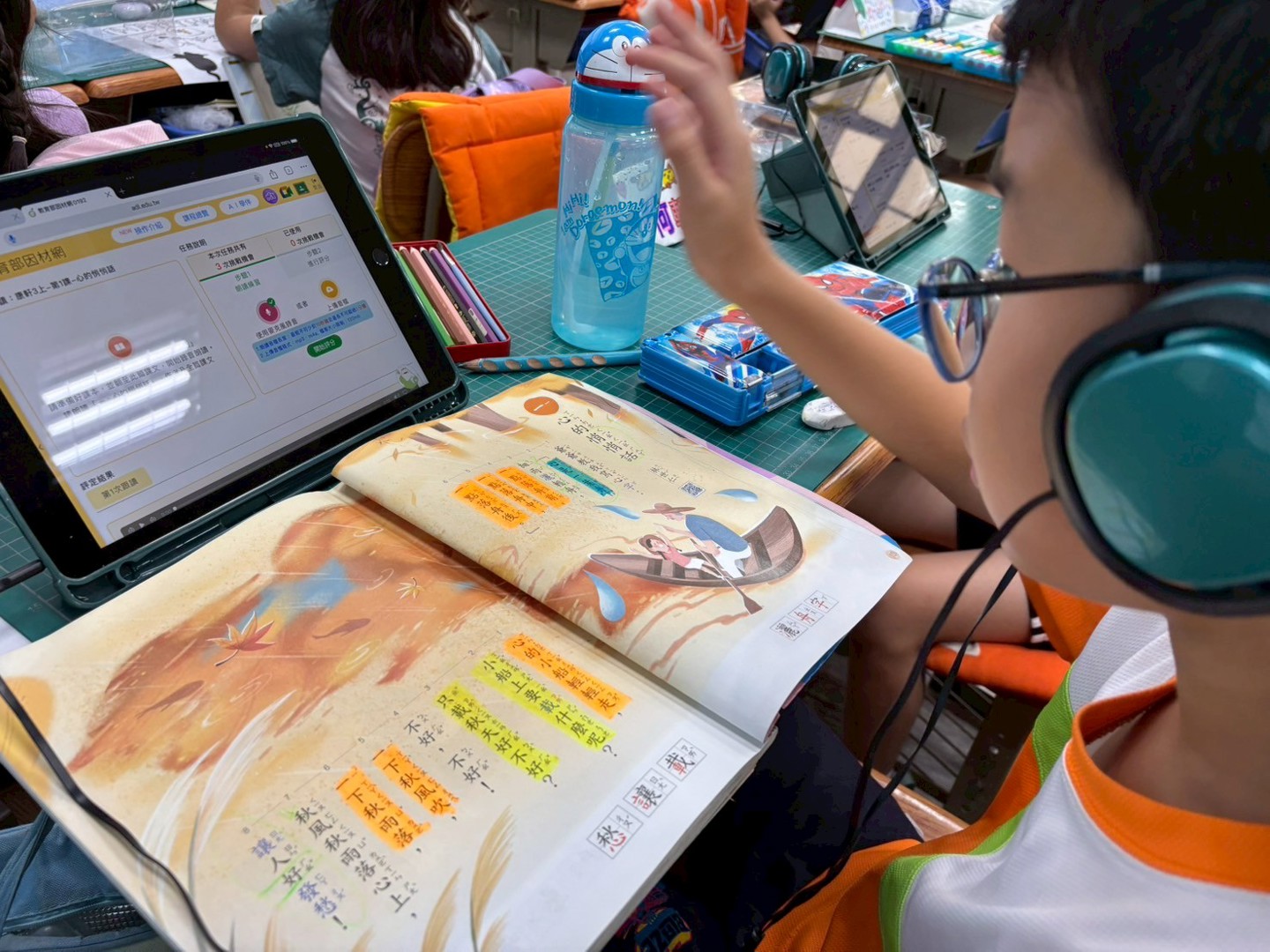 三年級小朋友運用「因材網朗讀功能」,在晨光時間展開語文預習與朗讀練習。孩子們戴上耳機,手握課本與平板,先練習朗讀課文,再對著麥克風朗讀課文,透過錄音比對與自我修正,讓語音更標準、語調、語速更自然。