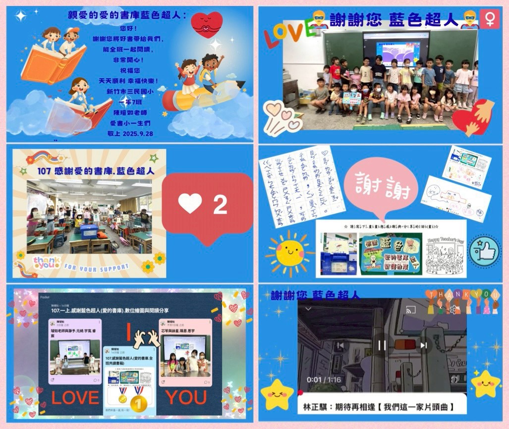 (3)教師帶讀「愛的書庫」全班共讀書,引導迷你短文寫作—感謝藍色超人,與共讀書閱讀創作。