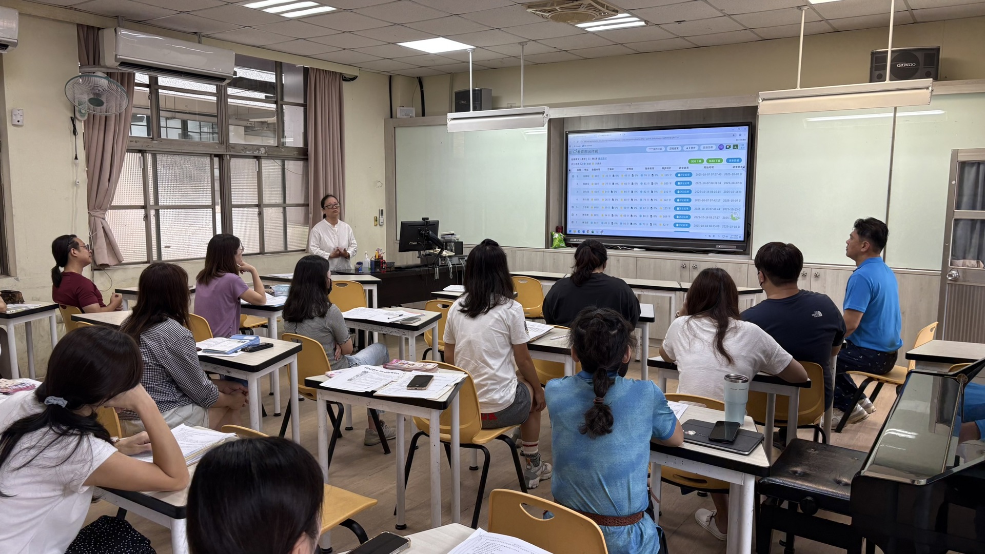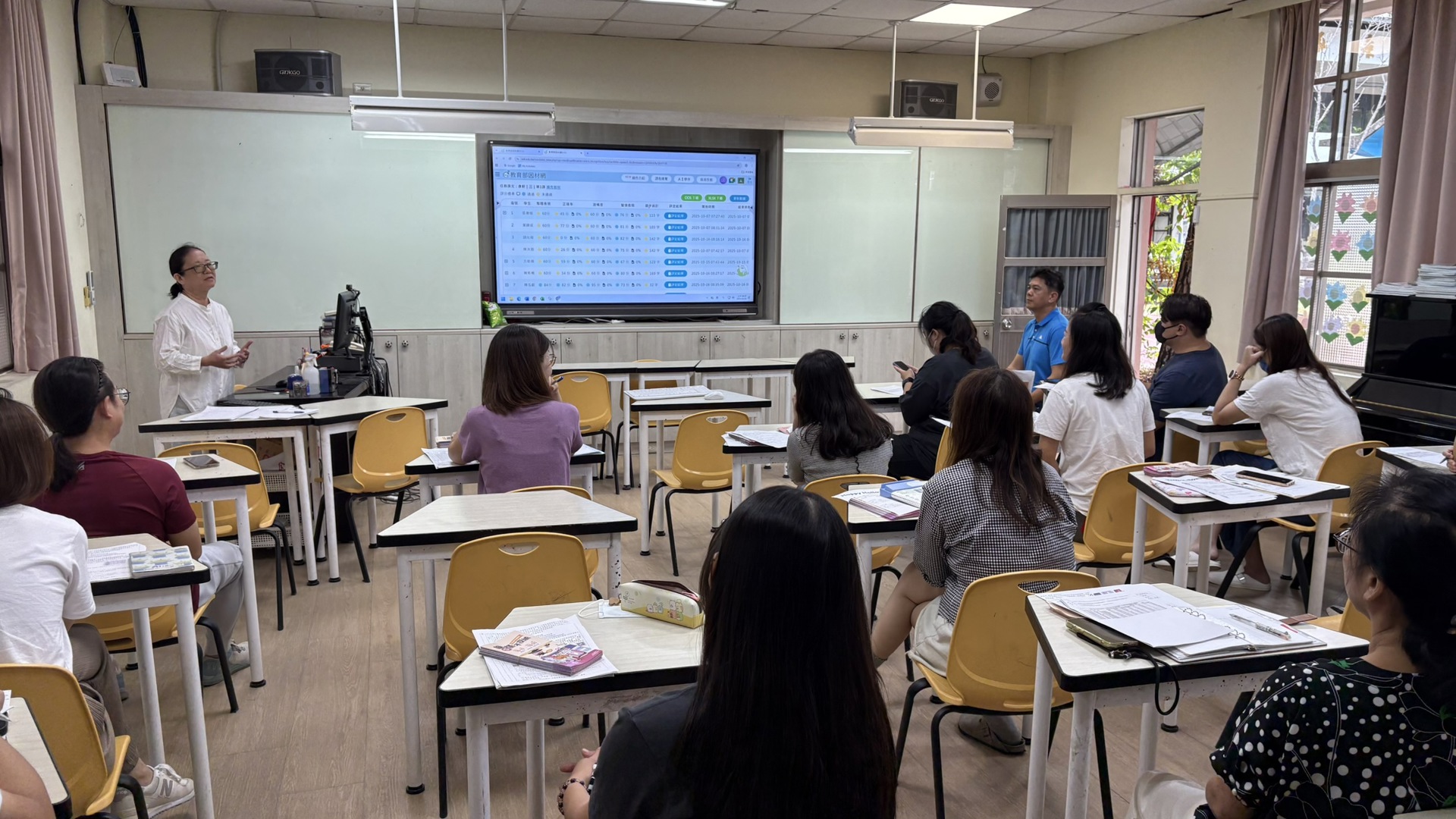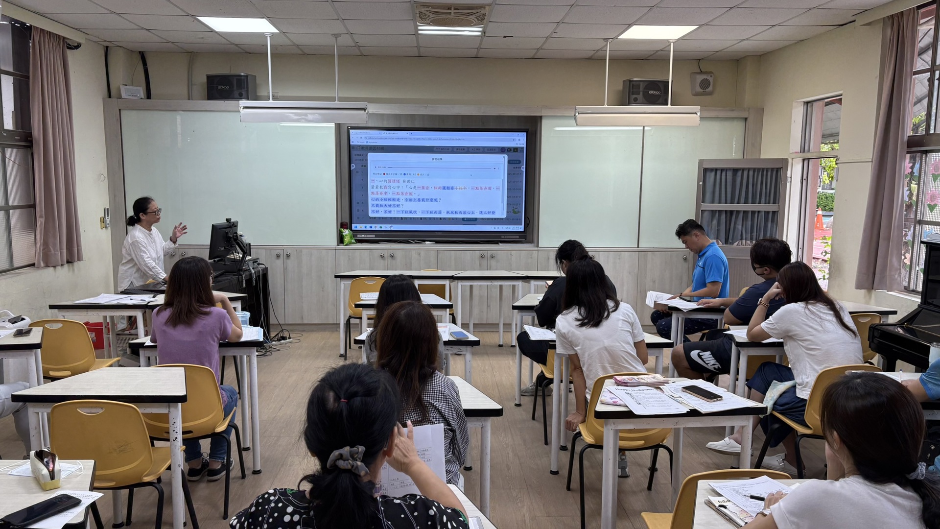 活動中,教師以教育部「因材網」平台為例,說明其朗讀練習能即時回饋學生的語音表現,協助孩子自我修正,並於課前多加朗讀課文,熟悉課文文章內容。教師同時展示班級管理與數據分析功能,讓老師能掌握學生的練習情況,進行個別化指導。
