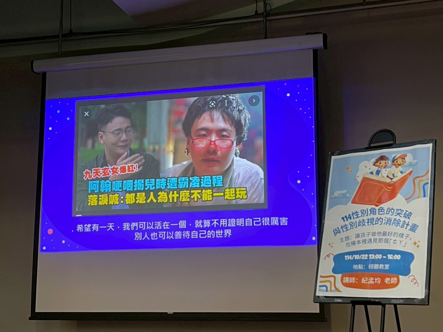 10月22日下午進行一場性別平等教育,從彭婉如命案到葉永鋕的離開,帶大家了解性別平等教育發展的歷程;從服裝設計師吳季剛到模仿達人阿翰,盼大家營造友善環境讓每個人能自在做自己;從二分法教育到典範人物的列舉,解構性別平等教育的迷失。