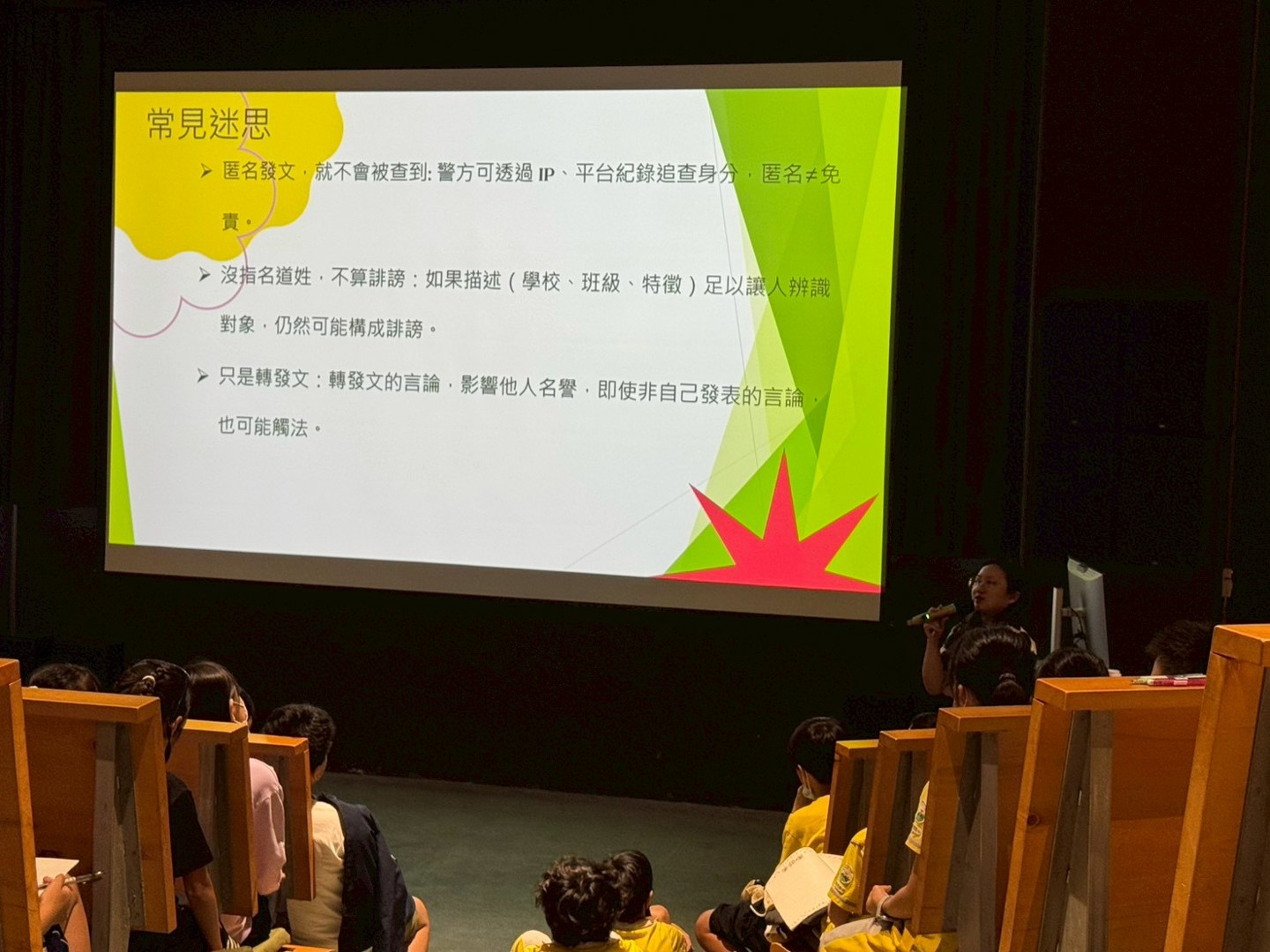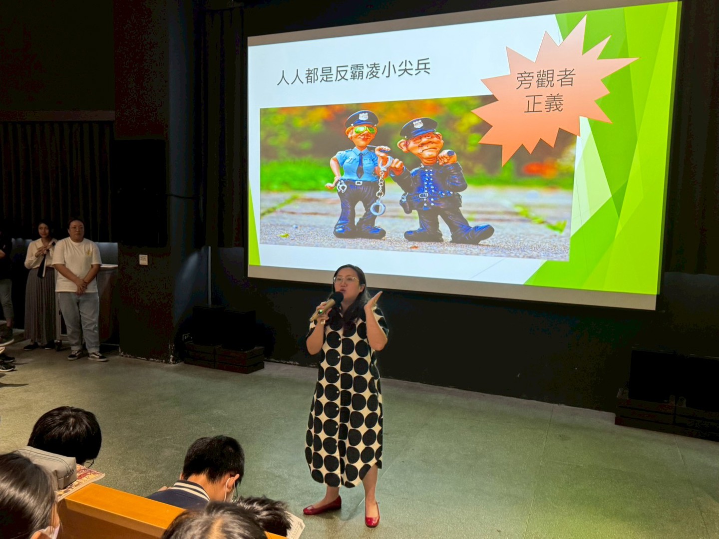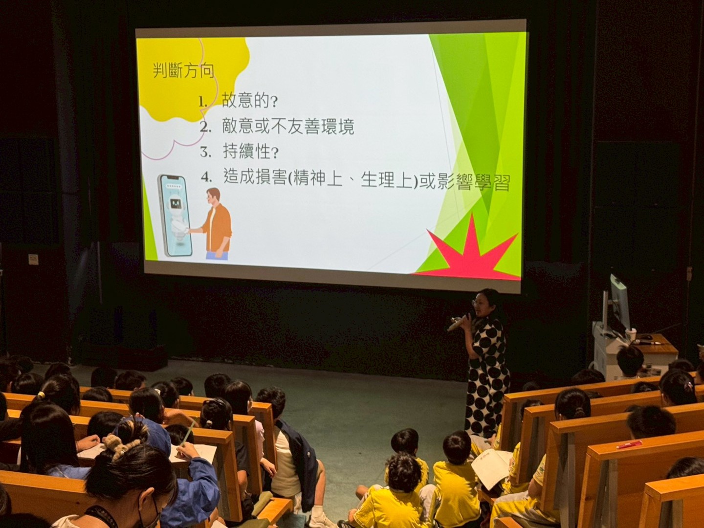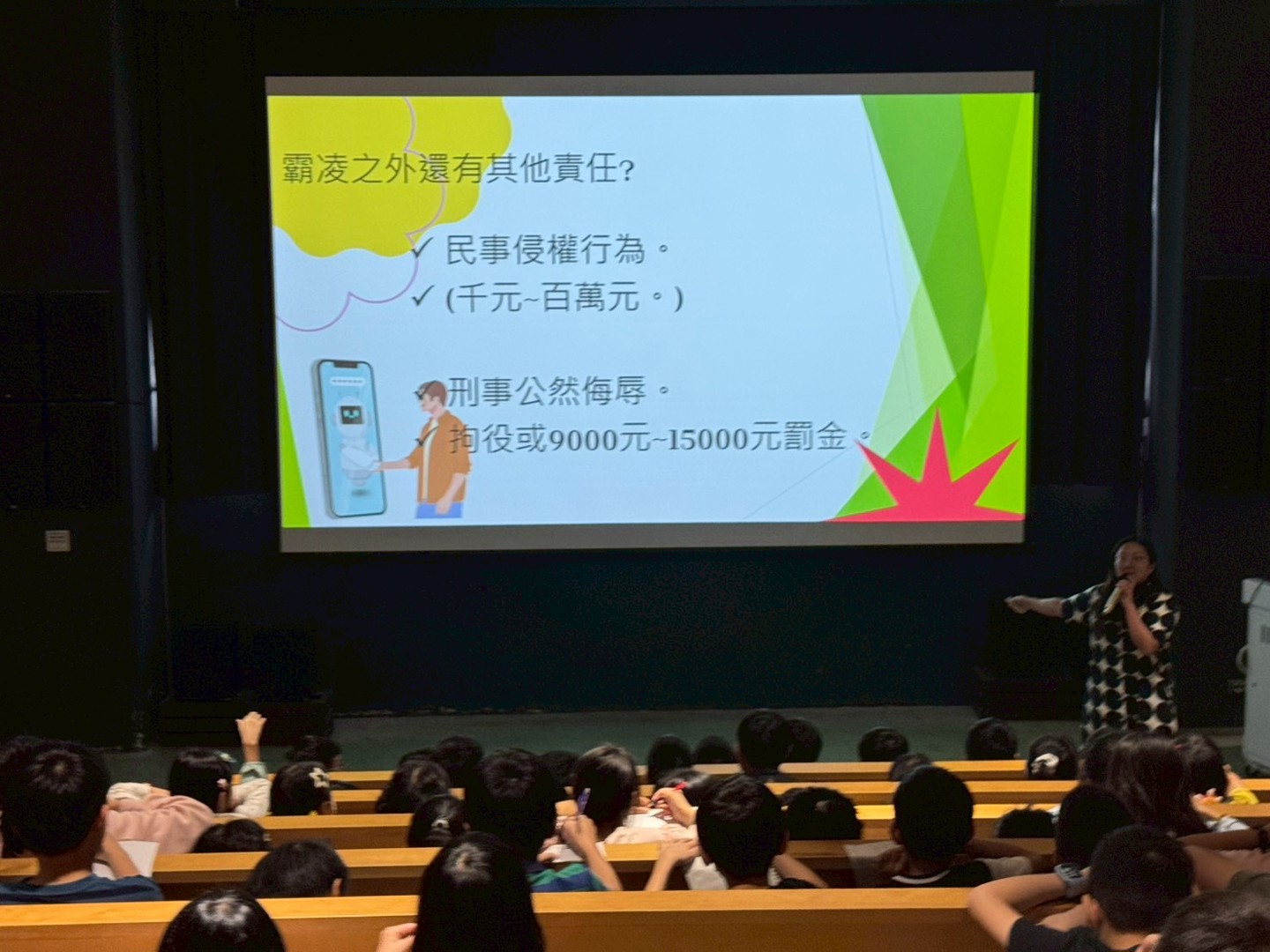 活動現場氣氛熱烈,學生們在觀劇與提問過程中,積極思考「這樣的行為應負的法律責任為何?」、「遇到類似情況時,該向誰求助?」等問題。林律師也提醒同學,當面臨衝突或霸凌時,應勇於表達、尋求協助,而非以暴制暴;同時也要尊重他人界線,學習換位思考,避免傷害他人。