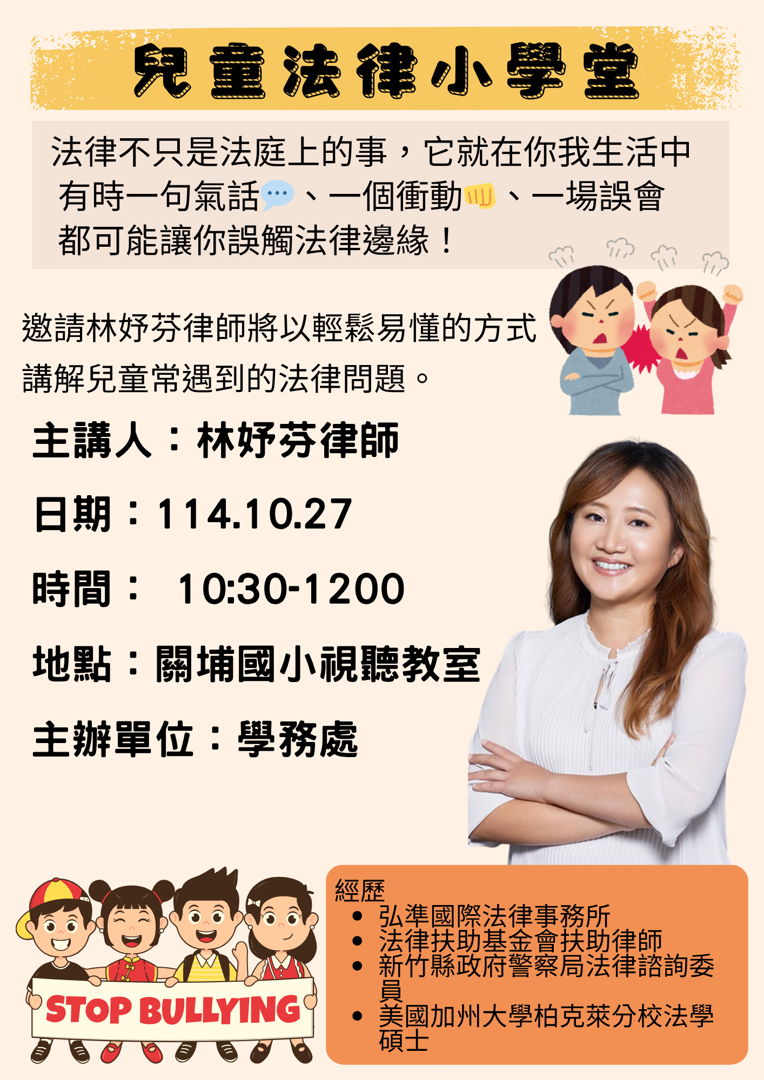 為深化學生對校園霸凌與性騷擾議題的理解,並培養法律素養與自我保護意識,關埔國小特別邀請新竹市社區關懷法律服務協會理事長-林妤芬律師蒞校舉辦「兒童法律小學堂」講座。活動以行動劇結合案例解析的方式進行,生動又具啟發性,讓學生在互動中學習如何辨識與預防校園中的不當行為。
