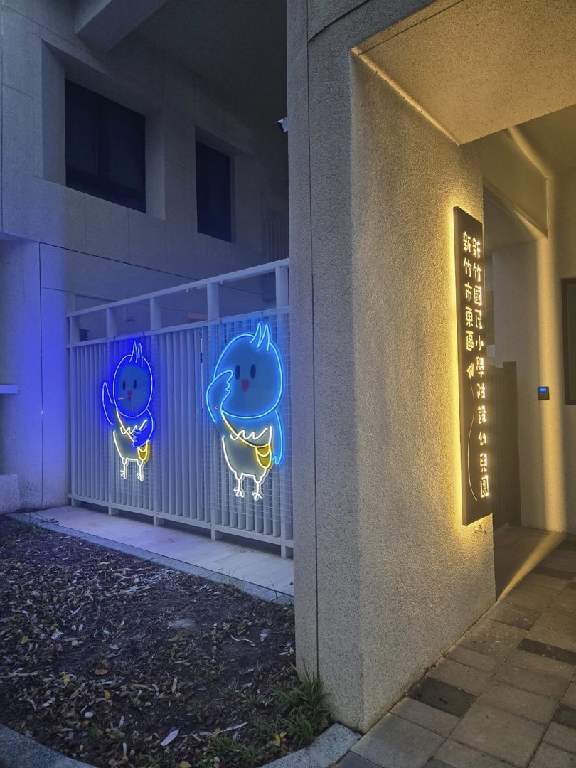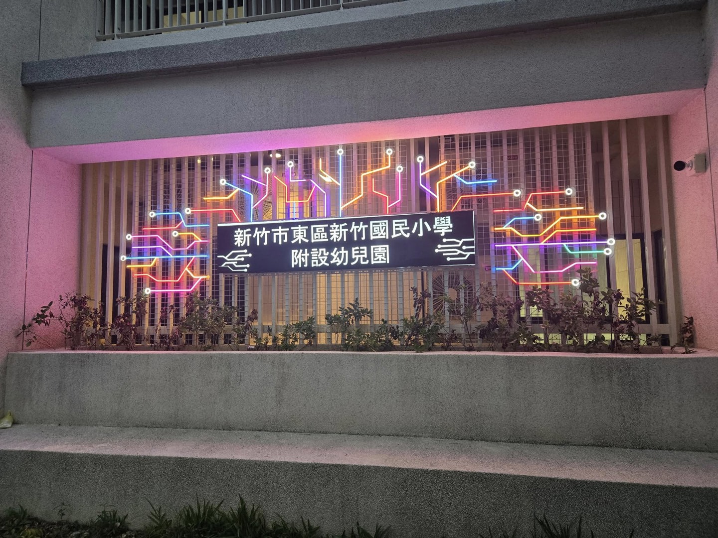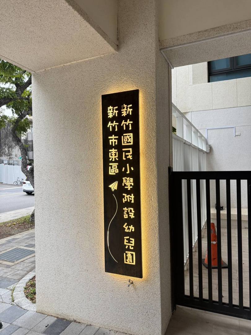 新竹國小附設幼兒園門口嶄新的招牌燈飾亮起,金色光暈映照著學校名稱,溫潤而典雅。這盞燈,不僅照亮了校園入口,也象徵著教育的溫度與希望。