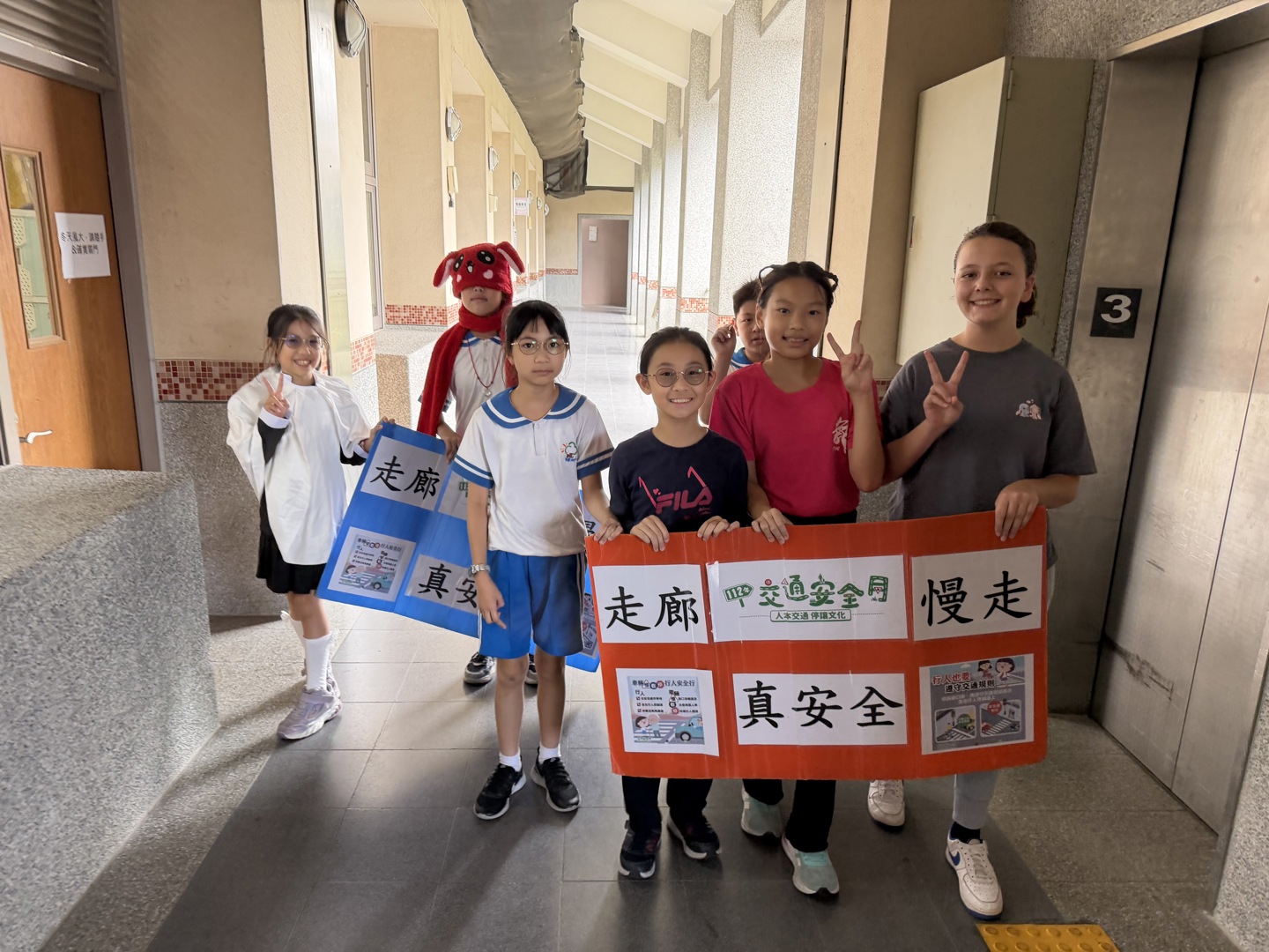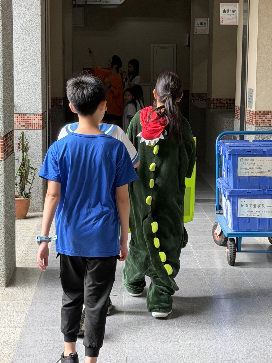 除了教室內的變裝秀,還有同學穿著恐龍裝、紅帽裝,走上校園走廊進行交通安全宣導🚸,用行動提醒大家:「走廊慢走,真安全!」