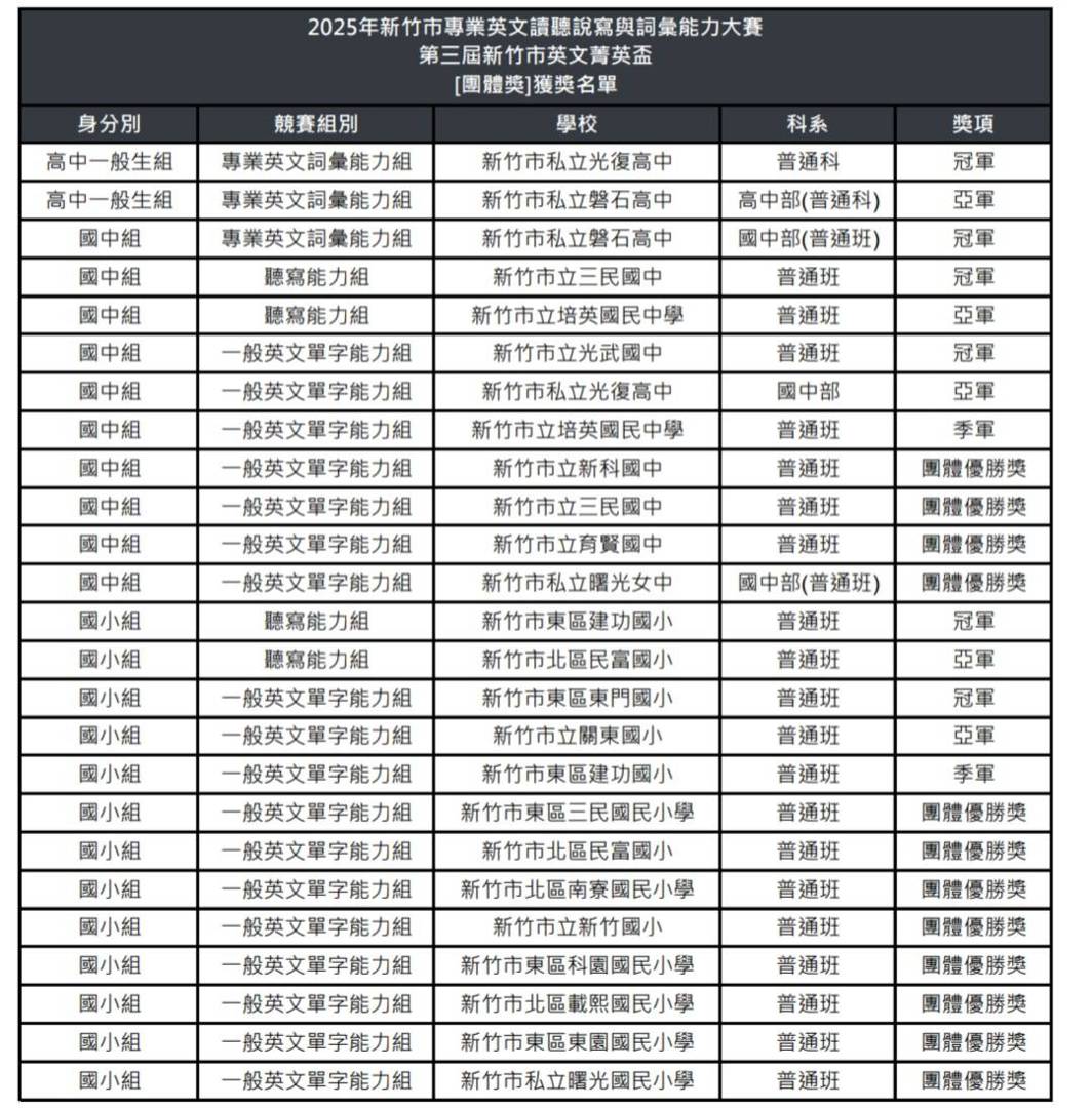 2025年10月18日(星期六),「新竹市2025年專業英文讀聽說寫能力與詞彙能力大賽」圓滿落幕!本校學生在此次競賽中表現優異,榮獲多項佳績。