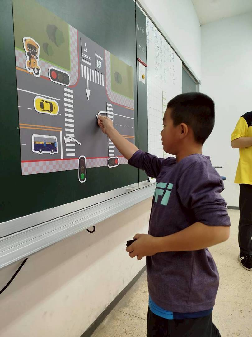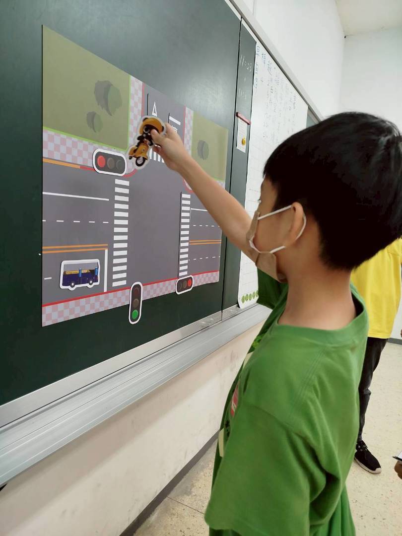 利用磁版上的道路、號誌與車輛模型,模擬真實交通情境,引導學生觀察與思考不同交通狀況下的安全作法。先讓同學知道號誌的意義,再讓同學知道支、幹線的差異,讓同學在實作中學習交通安全知識,提升了學習動機與理解效果。