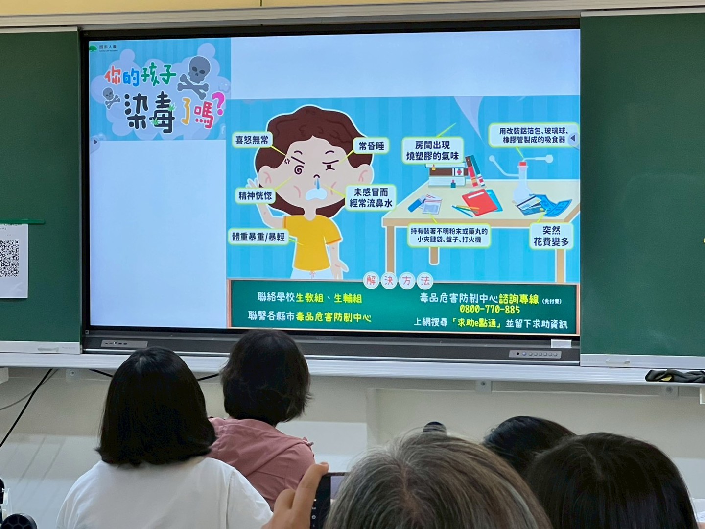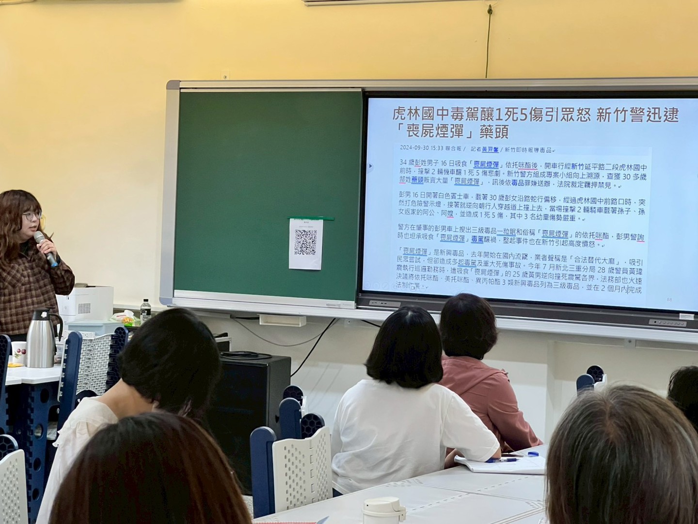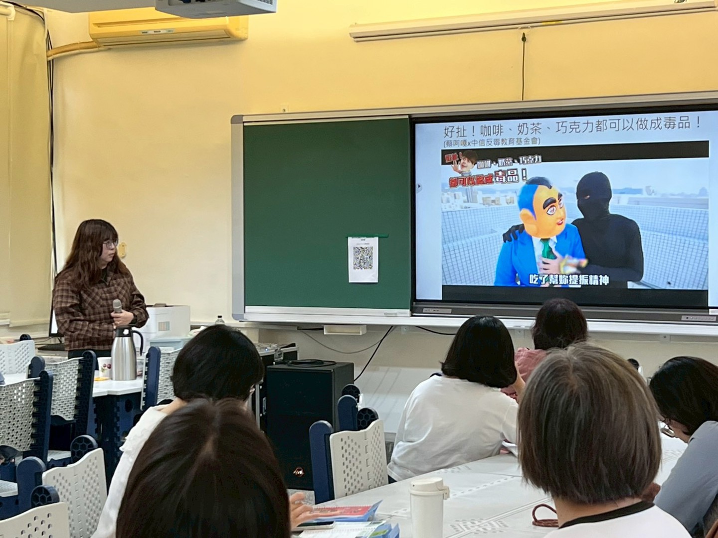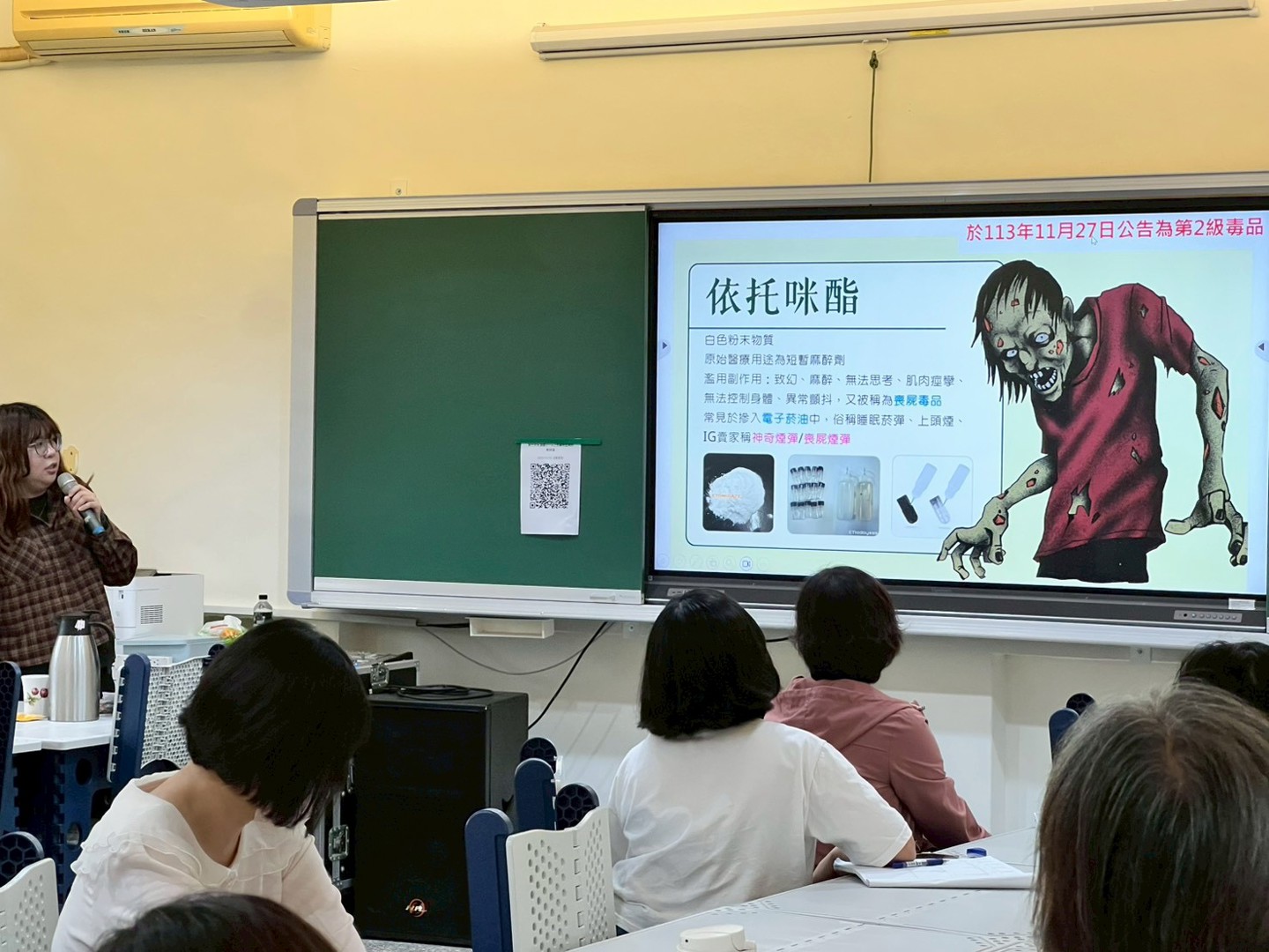 講師從從網路陷阱及網路犯罪等性平等兒少保概念切入,到認識青少年常見的毒品種類與新興偽裝手法,了解孩子可能接觸藥物的心理與社會原因,學會辨識藥物濫用的早期警訊與回應策略等來引導老師及家長。希望能透過此研習共同建立家庭與學校的防毒守門人網絡。