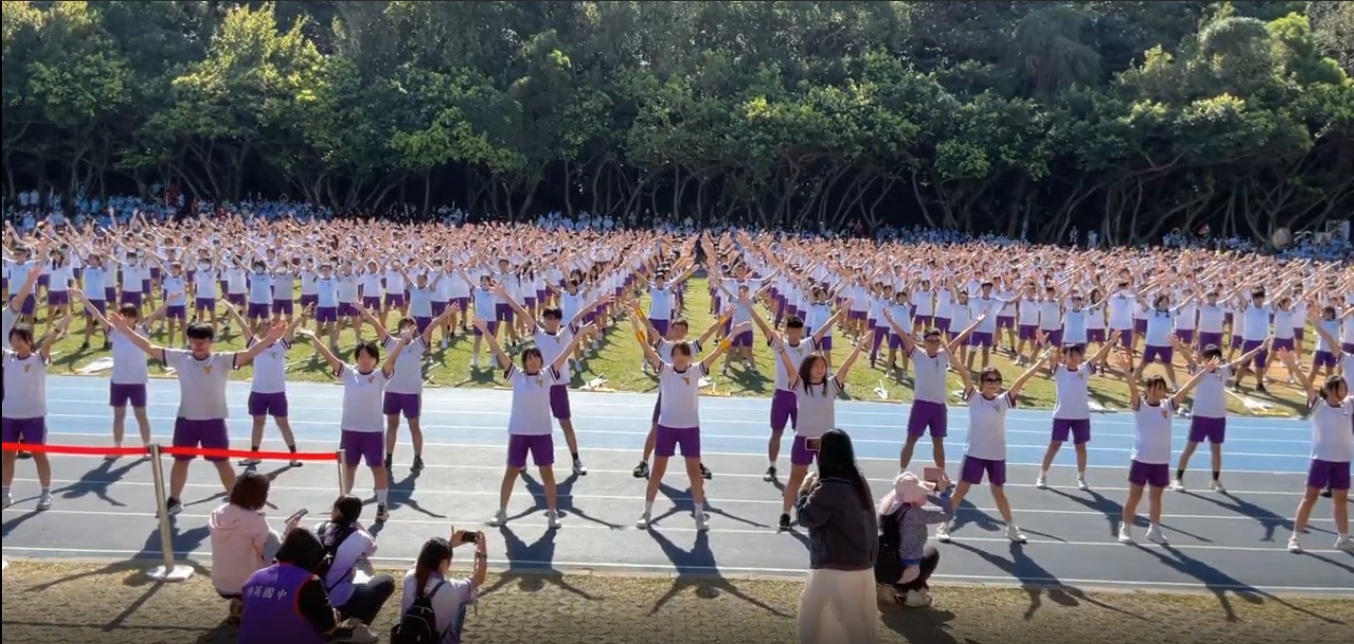 在熱烈的歡呼聲中,校長潘致惠帶領行政團隊與全體九年級同學率先登場,共同表演充滿懷舊氣氛的「國民健康操」,將在場貴賓與家長瞬間帶回純真的年代。隨後,隊伍迅速轉向充滿現代感的「新式健康操」,最終以時下流行的「露西健康操(Lucy Dance)」完美收尾,完成了一場「從懷舊到創新的健康系統更新」,贏得全場熱烈的掌聲。