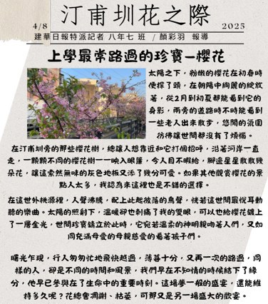 📰八年級「玩閱創」課程,進行「讀報教育」實作——從剪報、設計運動班報,到以《花現吧!汀甫圳》為題的校園新聞寫作,孩子們化身小記者,捕捉校園最真實的故事。
