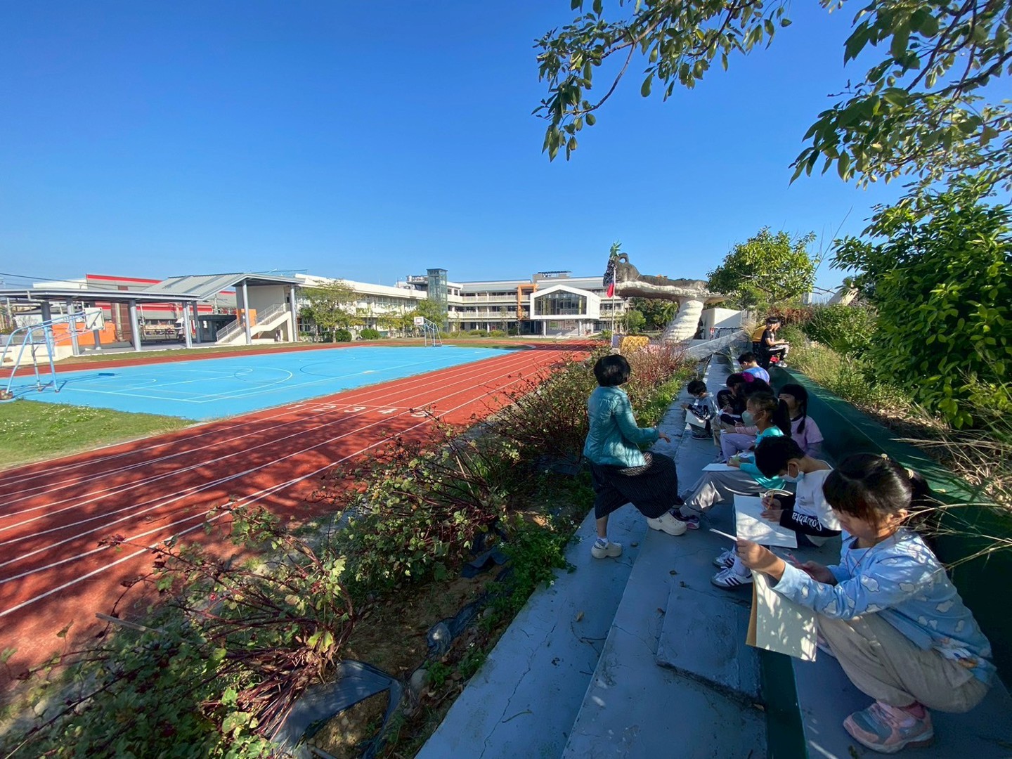 過程中,二年級孩子在雅玲老師的帶領下,他們走到駁坎上以不同的角度端詳校園景色,以寫實方式描繪港南校園。