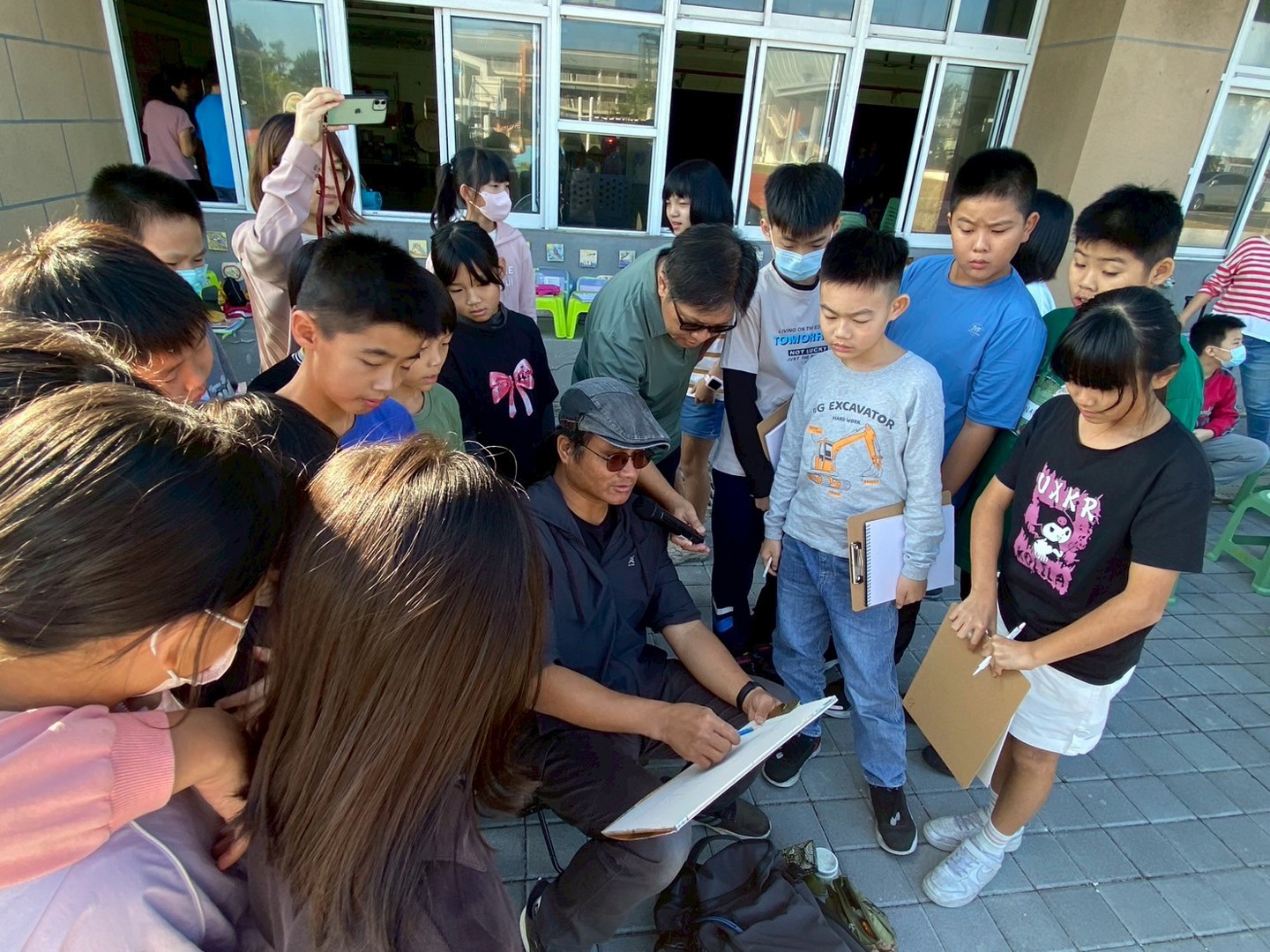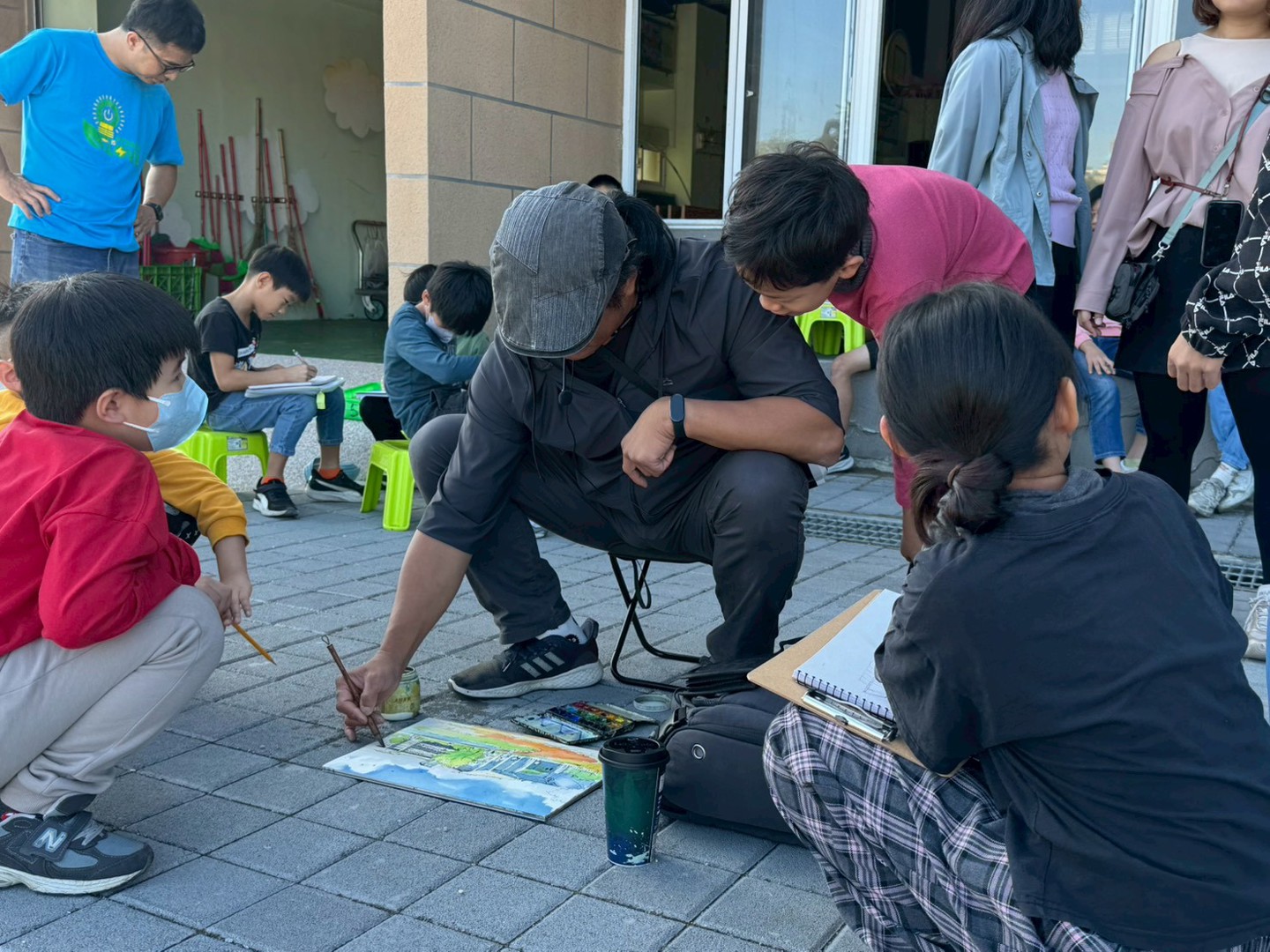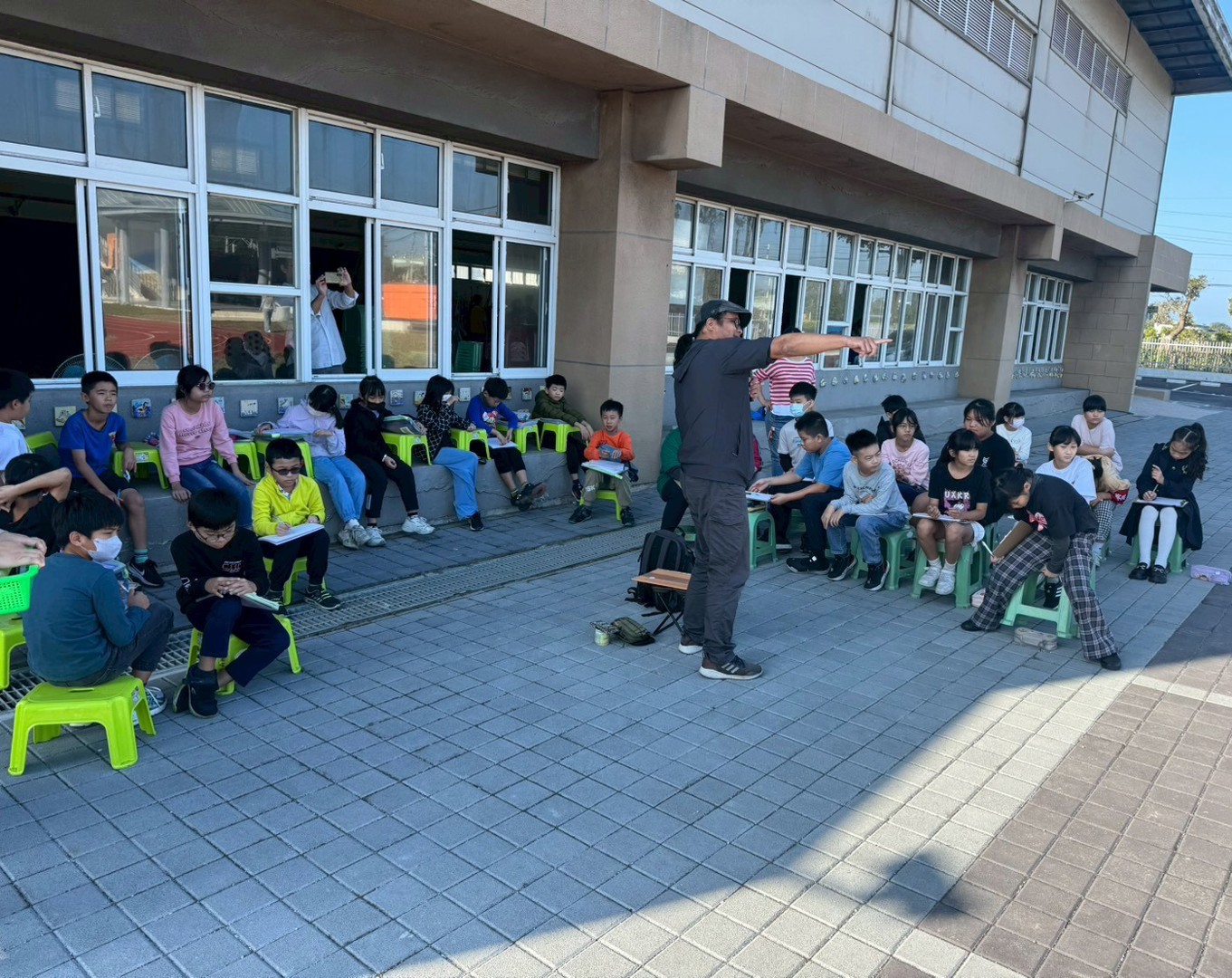 114.11.24 在今日的學生週會後,鄭開翔畫家與二、四、五年級的師生們,一同坐在體育館前的台階上,展開一場「港南校園寫生」的美學體驗課程。