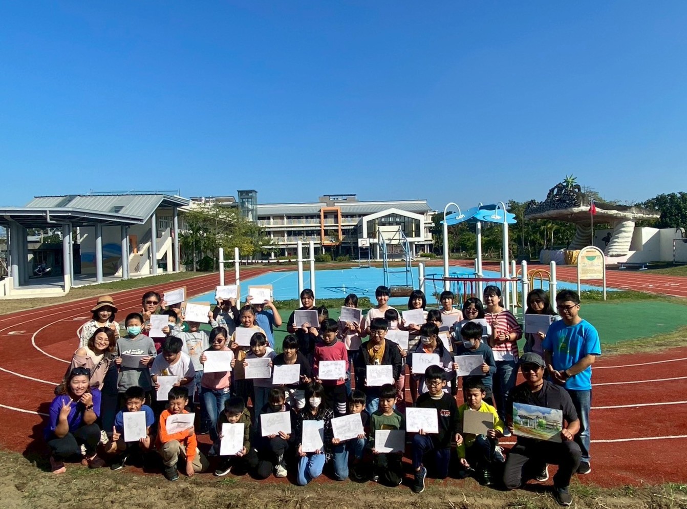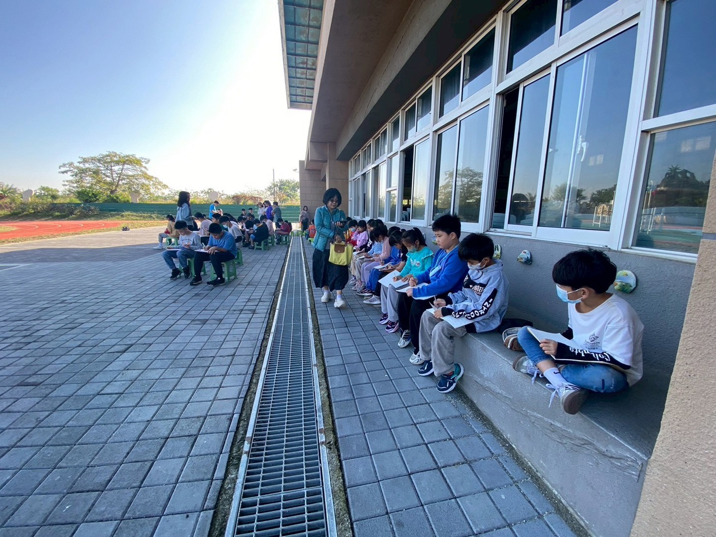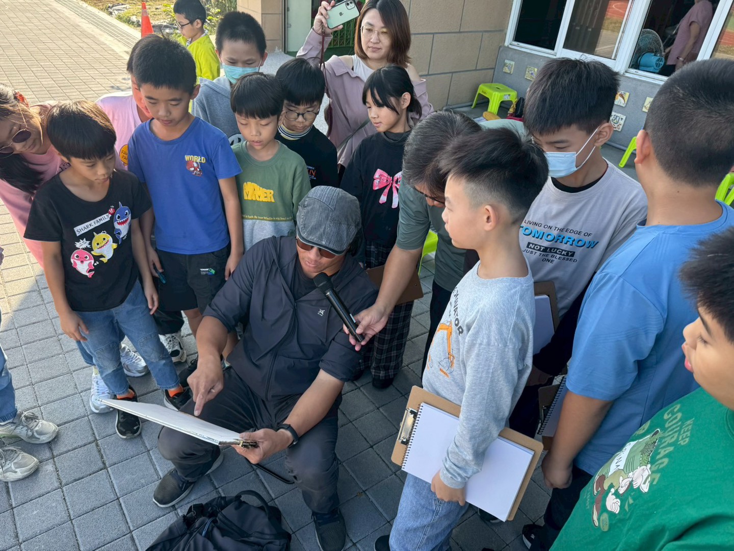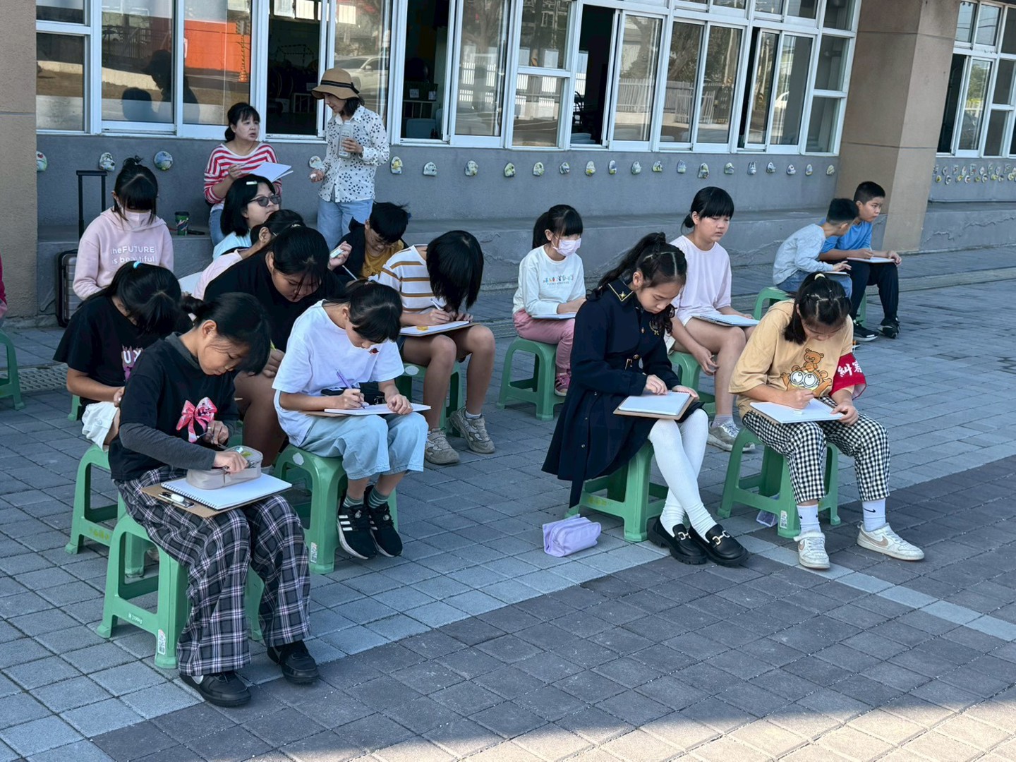 114.11.24 在今日的學生週會後,鄭開翔畫家與二、四、五年級的師生們,一同坐在體育館前的台階上,展開一場「港南校園寫生」的美學體驗課程。