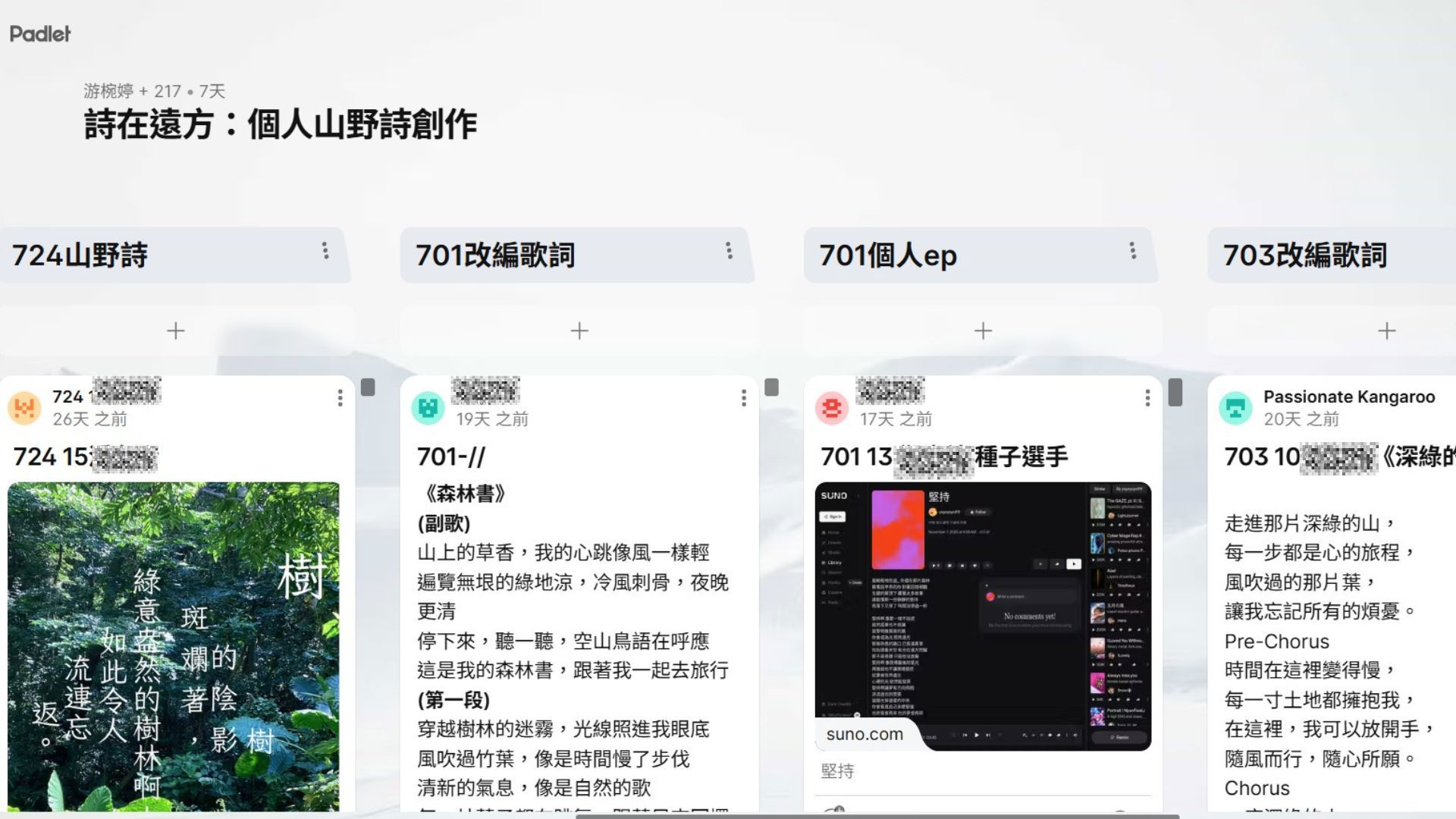 課程第二階段結合校定「山野 P 課程」,帶領學生走入真實場域。十八尖山走讀活動中,學生以身體感受自然意象,並同步使用「詩在遠方」互動式學習單記錄觀察。教師自製的「山野詩拉霸機」隨機提供字詞,幫助學生捕捉靈感與語言節奏。回到教室後,每位學生完成「個人山野詩」創作並使用 Canva 進行美編,同時將詩作改編為歌詞,深化語言表達。學生表示:「平常很少注意山裡的聲音,沒想到這次走讀後真的寫得出東西。」亦有人說:「拉霸機跳出的字太好笑,現代詩居然還可以這樣組合。」