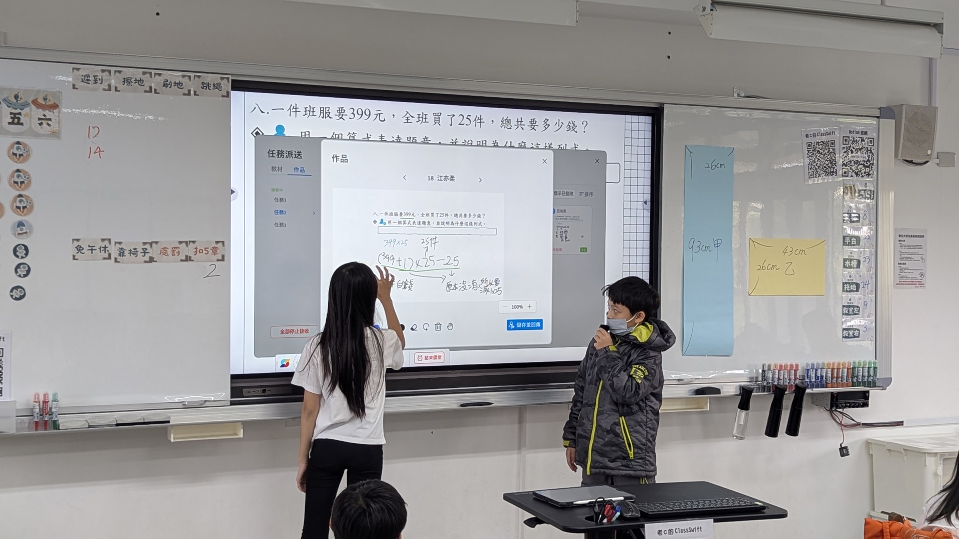 這堂課的重點不再只是死背公式,而是強調「自主思考」。教師首先拋出日常生活情境,引導學生將抽象的數學題意進行轉化 (Transfer),並動手執行 (Do)。課堂上,孩子們熱烈討論,嘗試擬訂解決問題的策略,並透過平板即時上傳解題過程。