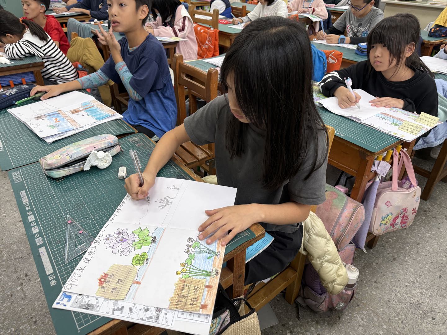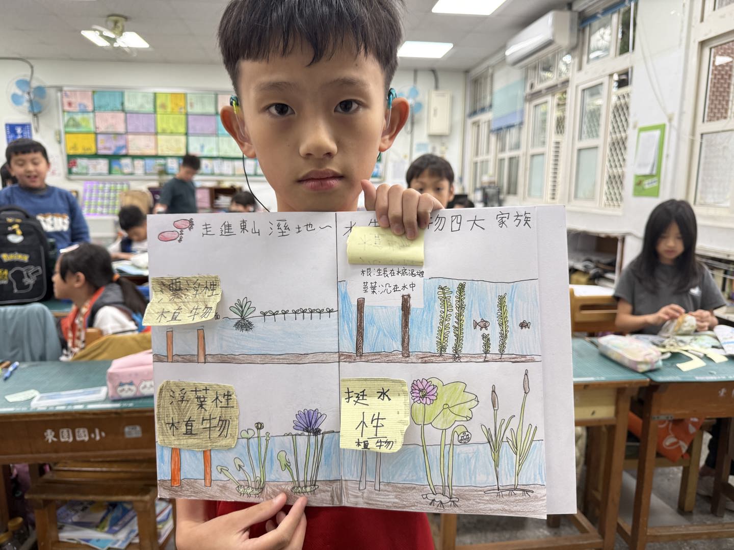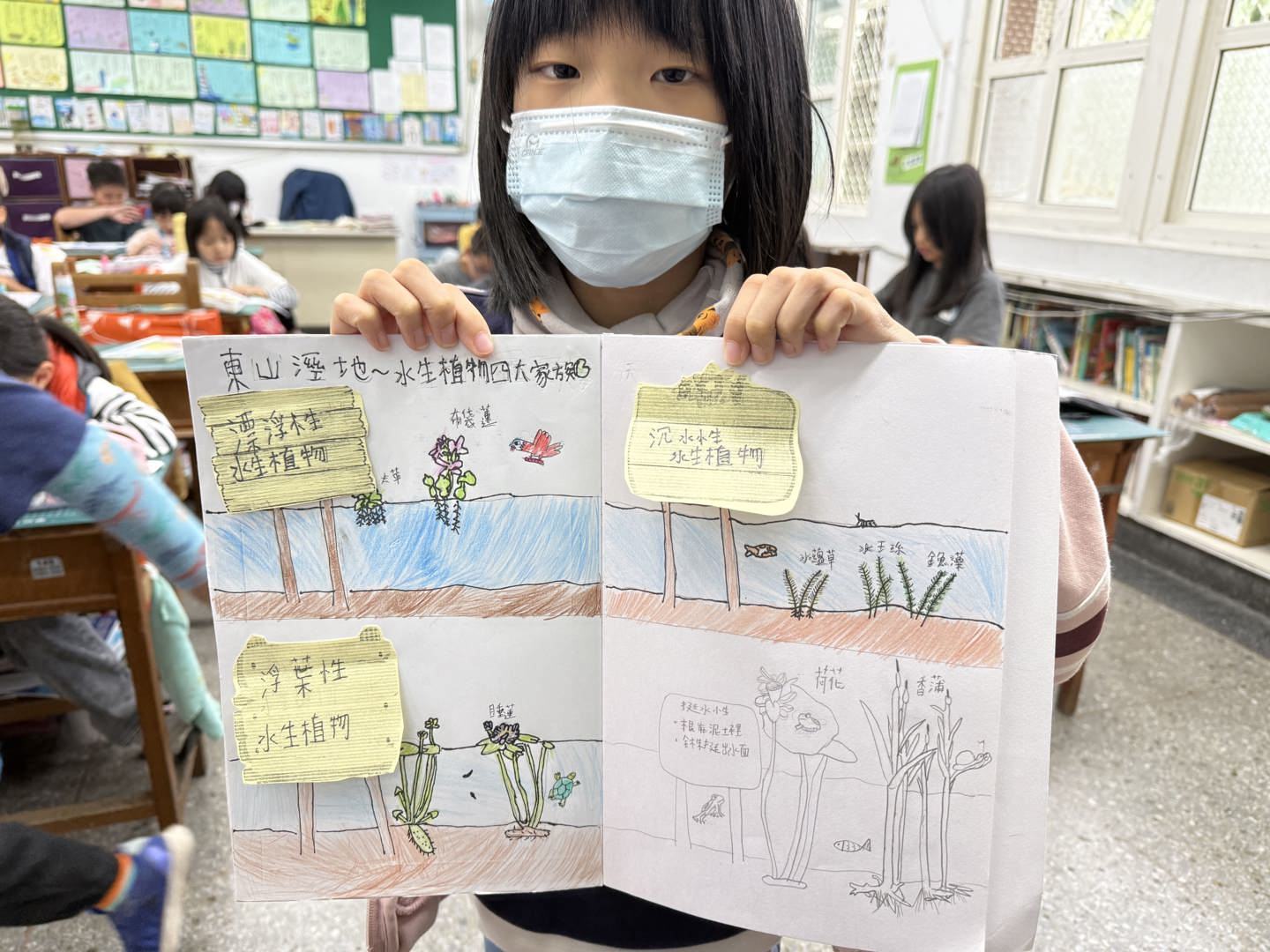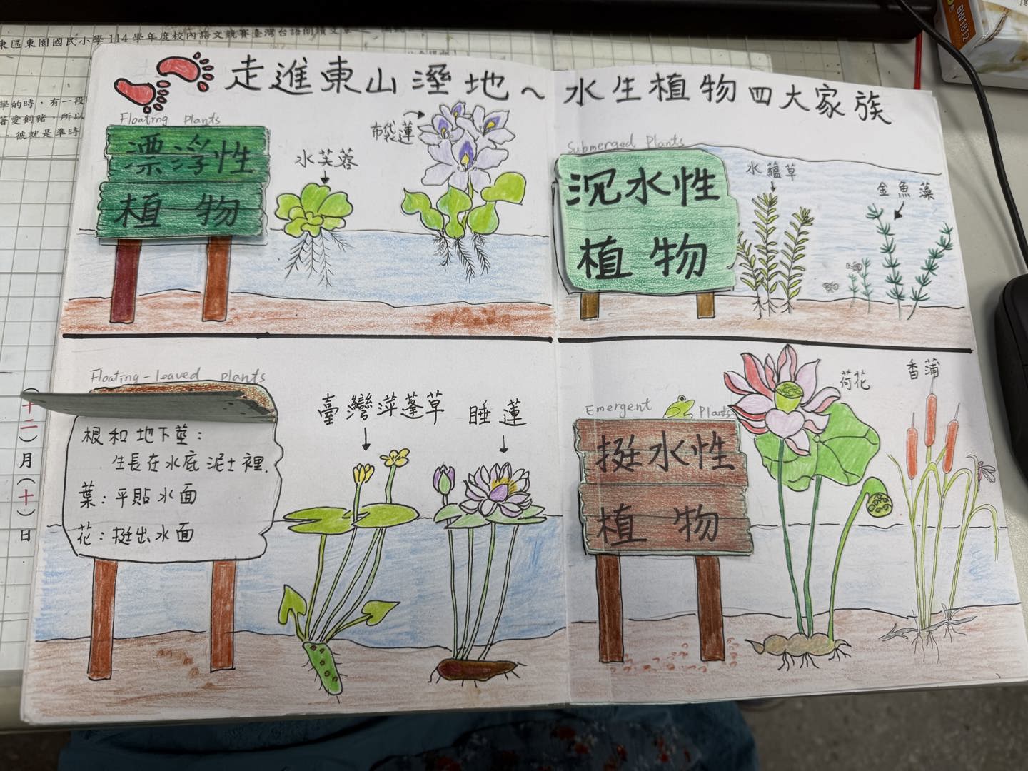 回到學校,我們將所學到的四大水生植物,分類描繪這些植物的特徵,孩子們很認真的觀察這些水生植物的差異,所以畫出來的作品寫實又細緻,能感受到他們對這次的東山溼地踏查是非常用心的學習。