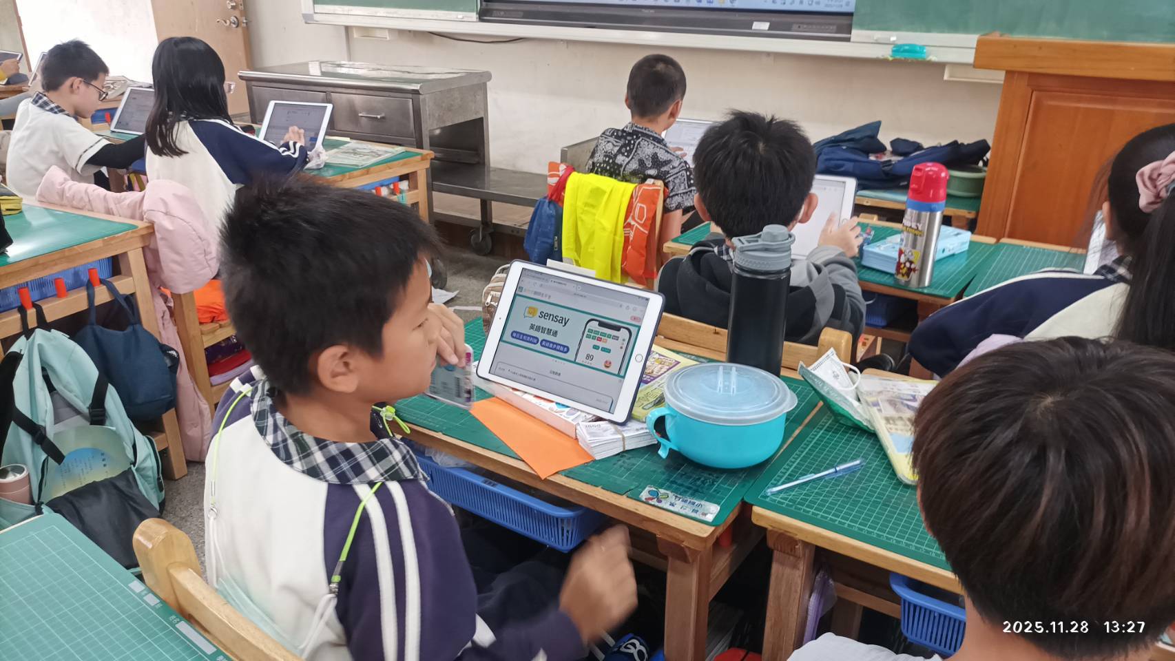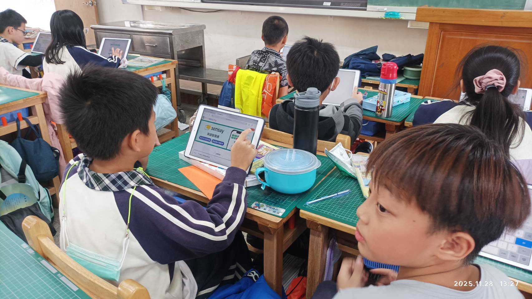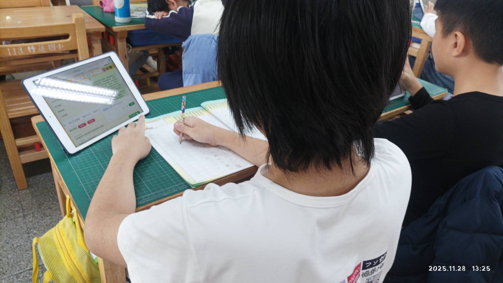 課堂中,學生熟練操作平板查閱範文、規劃段落結構,並依平台提示即時修正用字與語病,學習歷程清楚而有秩序。孩子們專注投入、彼此討論、勇於發表,不僅展現扎實的語文基礎,也表現出良好的資訊素養與自主學習能力。科技不再只是工具,而是引導學生深度思考與精進表達的重要助力。尤為可貴的是,今日即使由代課教師授課,四仁班學生依然秩序井然、安心專注、學習節奏穩定,顯示良好學習態度早已內化為班級文化。這份自律與專注,並未因為授課老師的不同而影響,這也是長期閱讀訓練與資訊融入教學相互加乘的成果展現。