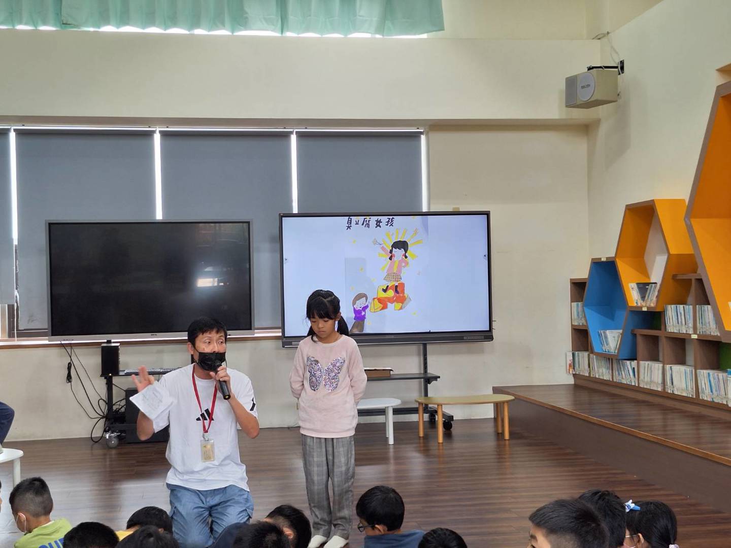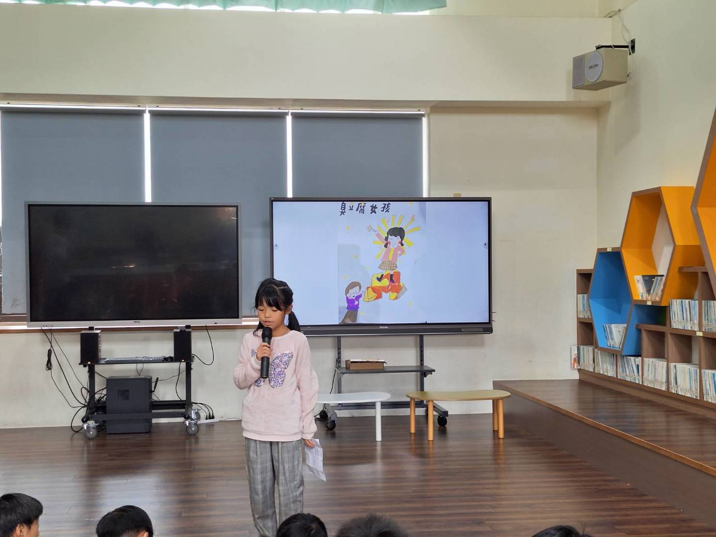 114學年度圖書館週系列活動中,「好書分享」是學生最期待的活動之一,今日由四年孝班湘璇與晨諳兩位同學擔任首發的小小閱讀分享員,分別分享《毛毛兔好快樂》與《臭豆腐女孩》兩本書,在溫暖又充滿書香的木地板區裡,為全校師生帶來一場兼具童趣、情感與勇氣的閱讀饗宴。
