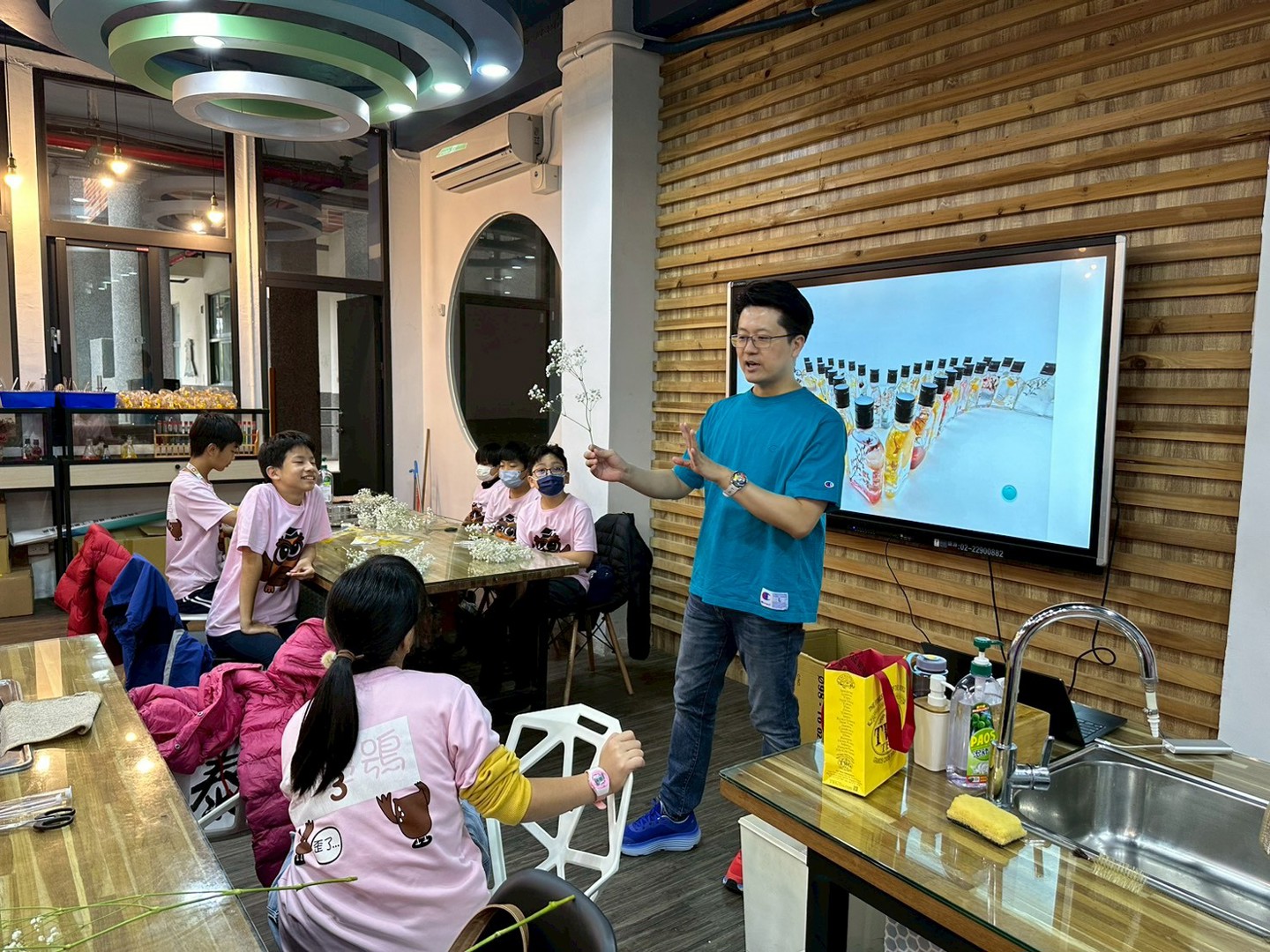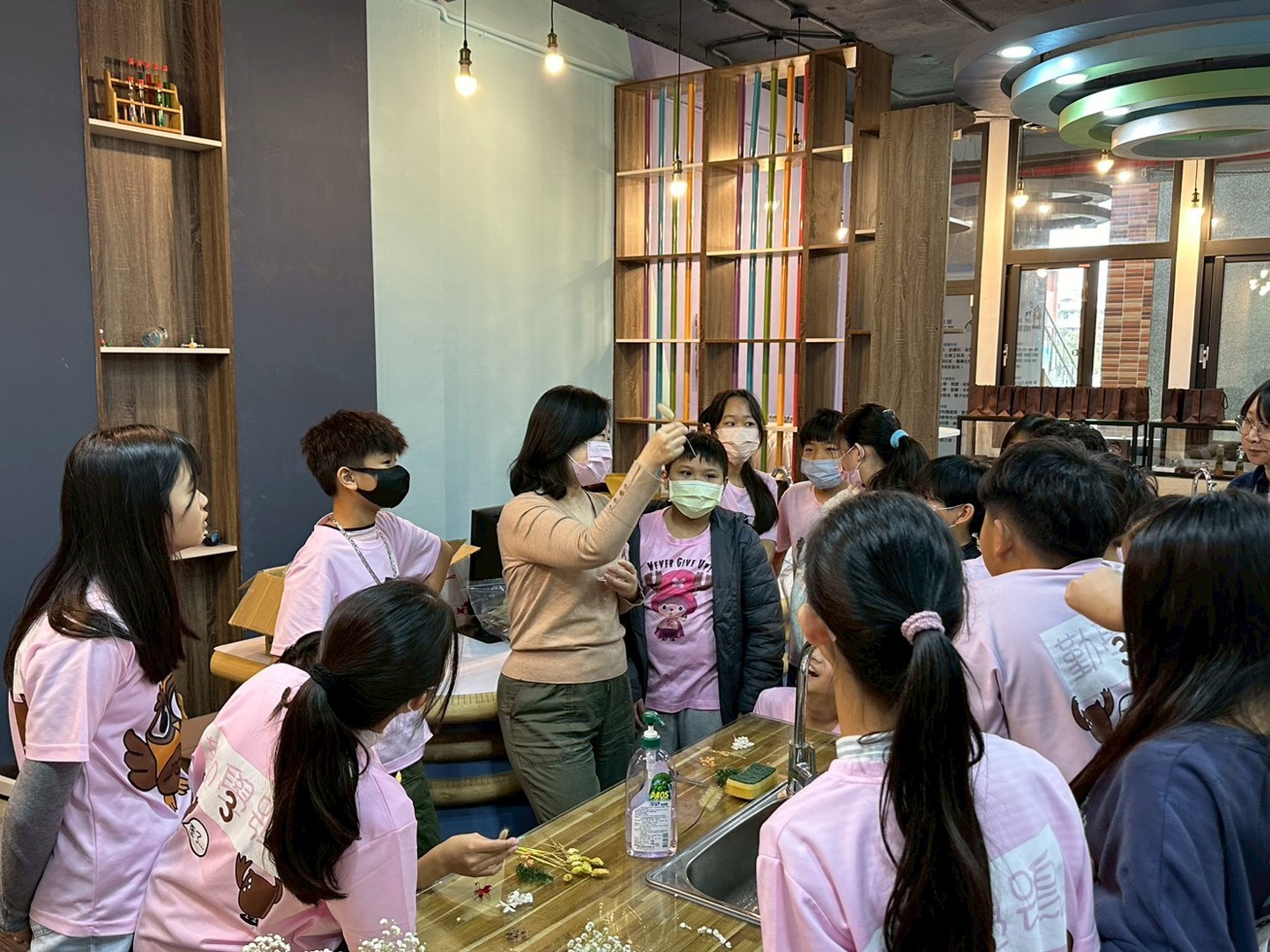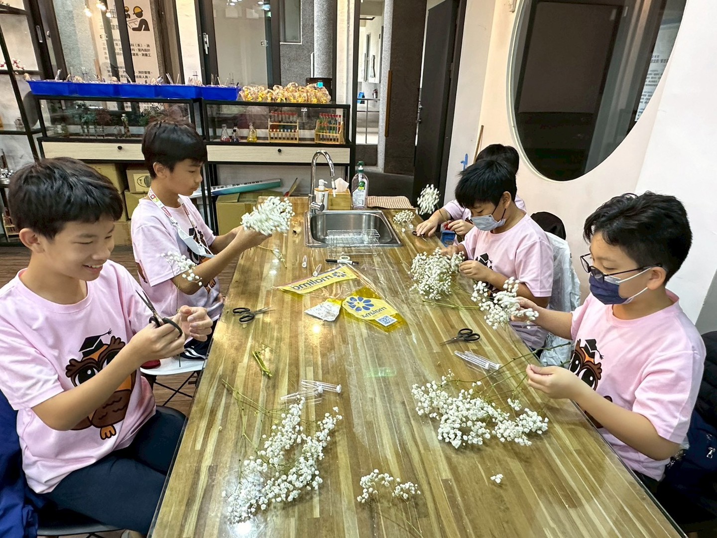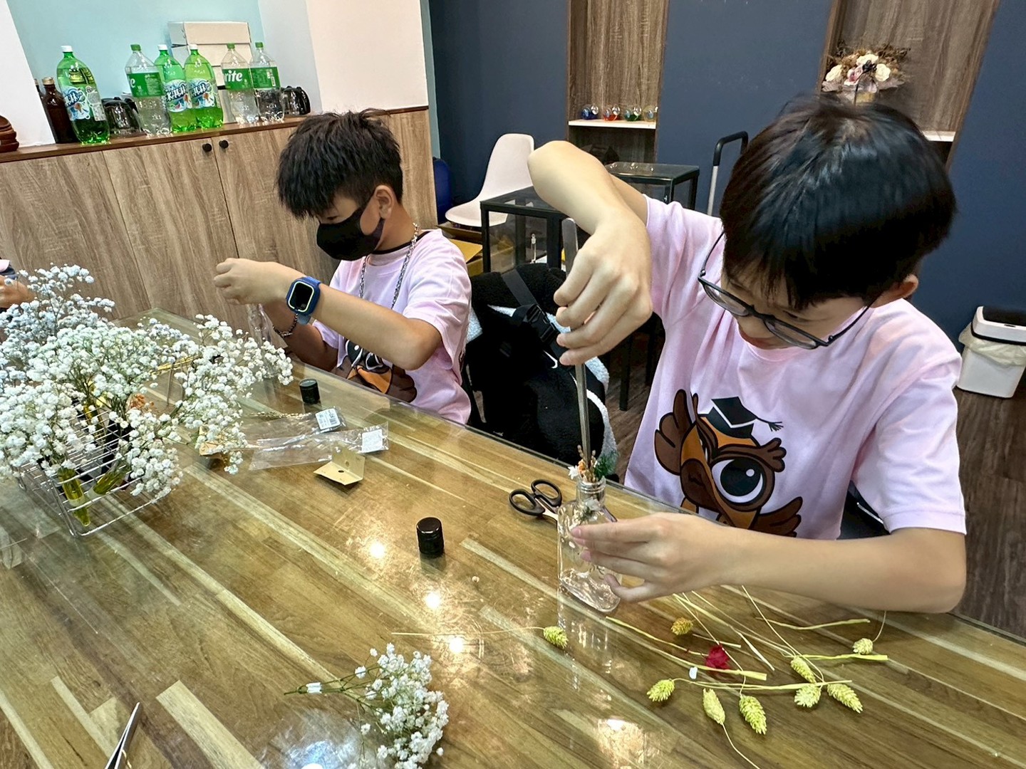 活動上半場,講師首先介紹永生花、乾燥花、香皂花、索拉花與仿真花的差異,從材質、保存方式到辨識技巧,以顯易懂的說明讓學生了解,提醒學生未來在購買花藝作品時能更加注意與判斷。隨後進入滿天星永生花製作體驗,學生們小心翼翼地將新鮮滿天星分束,再將自己喜歡色調的「凍齡液」倒入試管中進行浸染。經過約 24 小時的等待,滿天星便能呈現出鮮豔持久的色彩。在操作過程中,孩子們展現十足的細心與耐心,深怕破壞脆弱花材,同時也對凍齡液能使鮮花「永保亮麗」的效果感到驚奇。