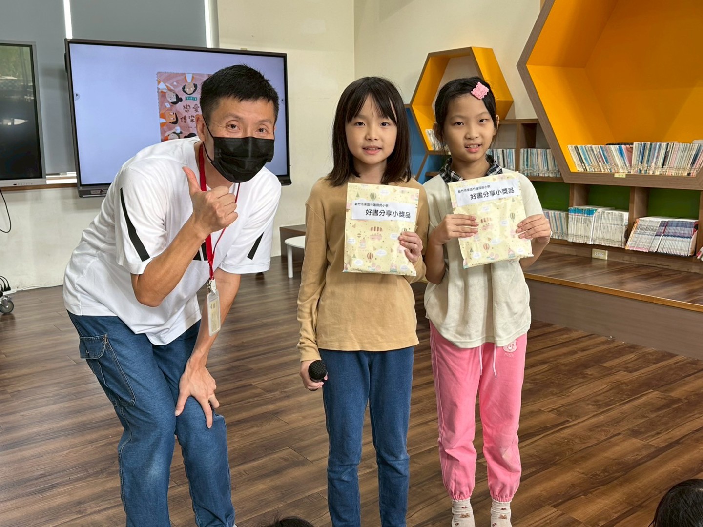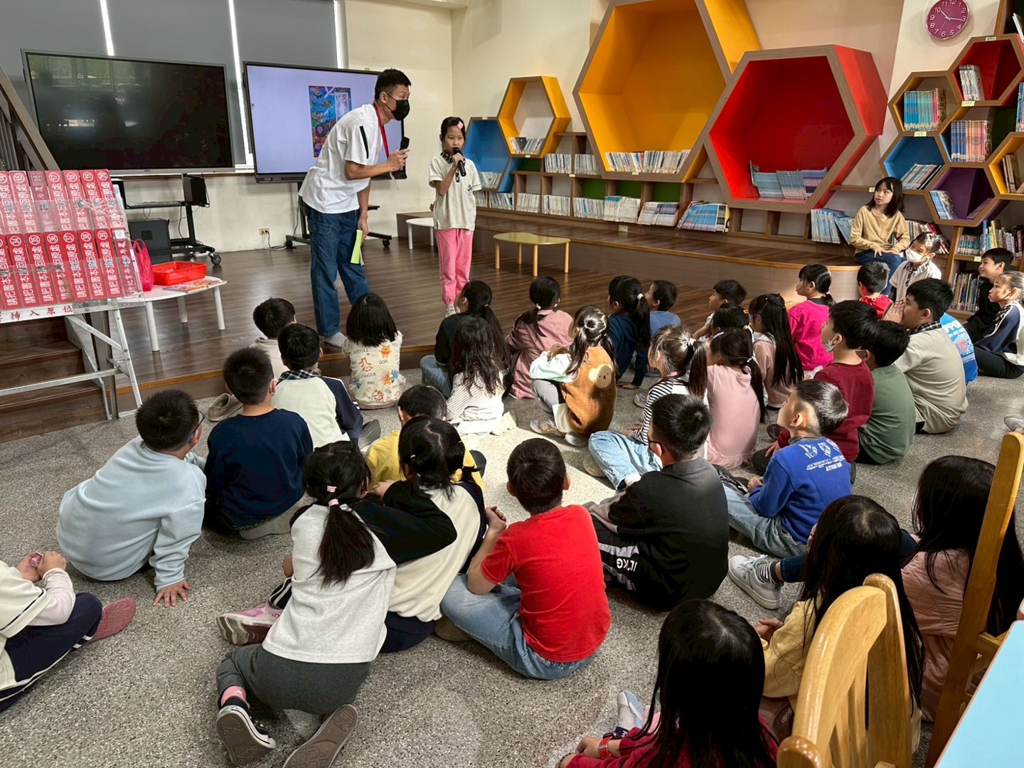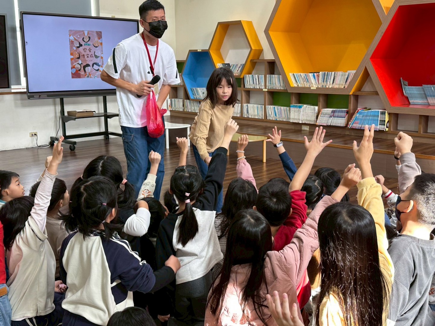 活動現場秩序井然,聆聽的孩子們安靜專注、踴躍回應,充分展現本校長久以來所培養的守秩序、勤閱讀、懂尊重的優良學習風氣。分享結束後,小魏老師也利用這個時間讓同學們主動舉手發表,針對故事內容交流想法,在互相傾聽與回應中,展現良好的溝通態度與同理心。