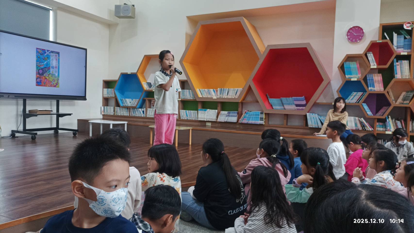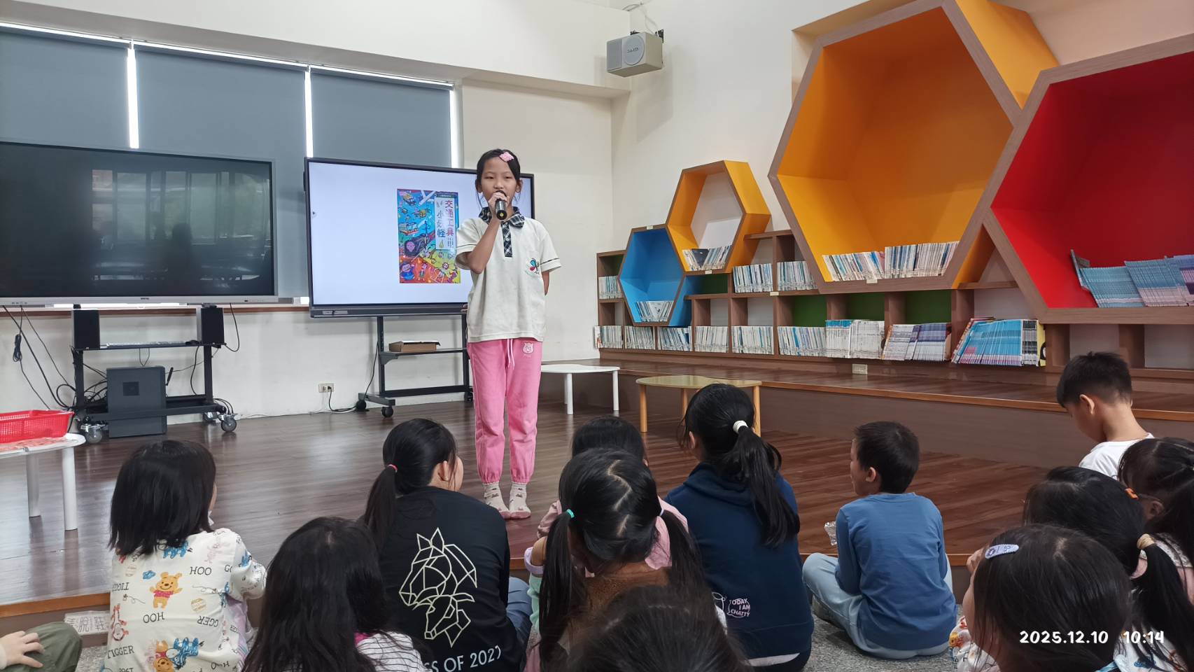 顏立同學分享的《交通工具的小妖怪》,透過擬人化的妖怪角色,描繪各種交通工具的個性與任務,不僅充滿童趣,也巧妙融入交通安全與守法觀念。顏立以清晰的口條與生動語氣,帶領同學認識交通規則與遵守規矩的重要,並提醒大家「守秩序就是保護自己,也尊重他人」,獲得在場中低年級的小妖怪迷們熱烈肯定。
