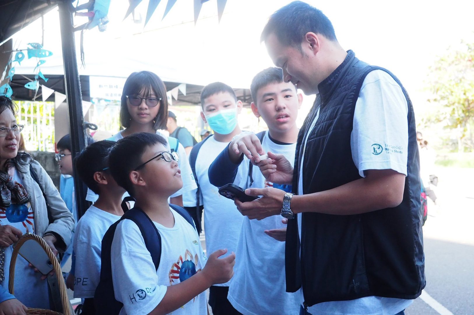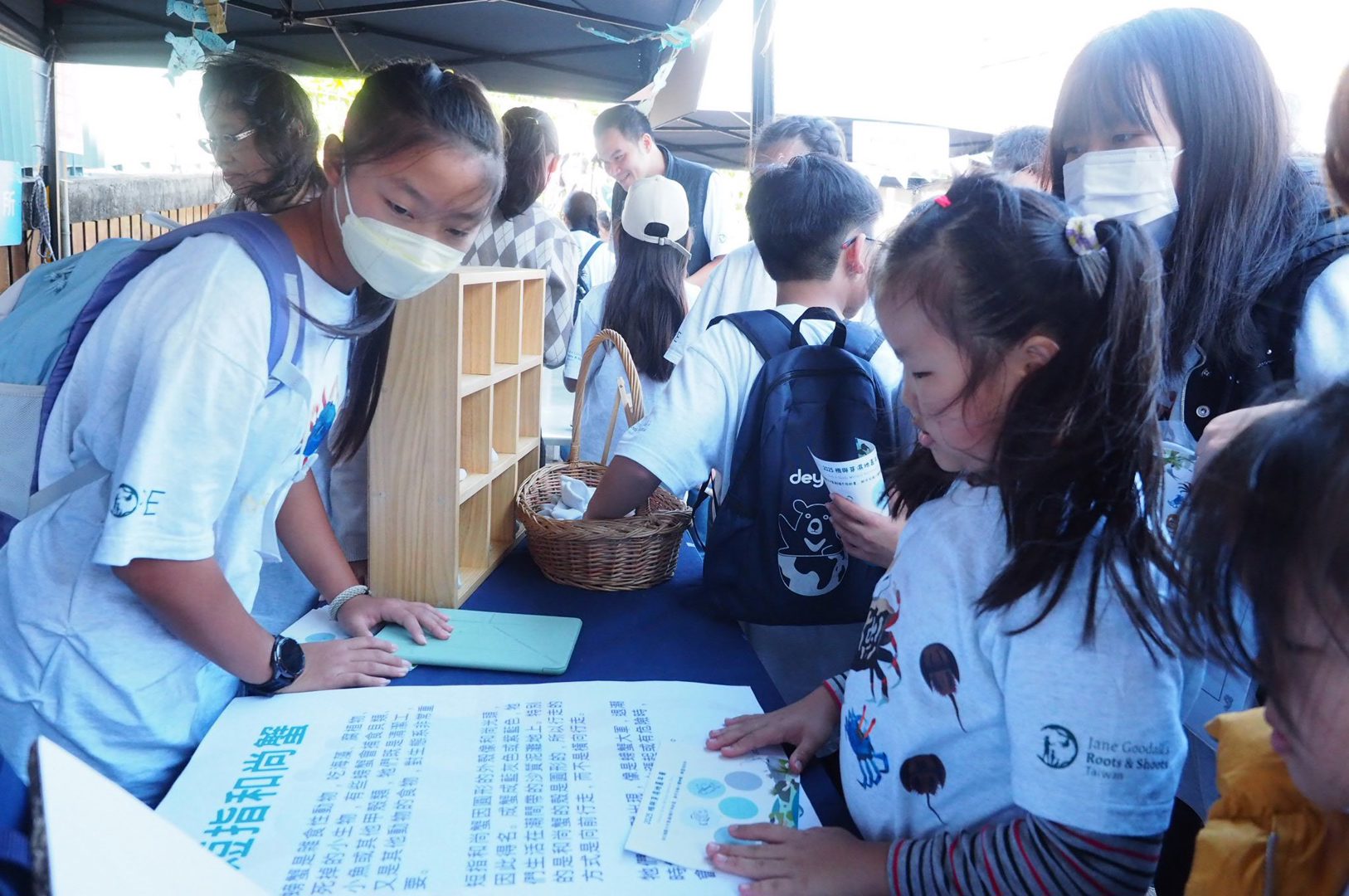 五、六甲孩子輪番上陣,為來到攤位的大小朋友介紹香山濕地上棲息了一億隻的和尚蟹。除了當和尚蟹的親善大使,孩子們也攜伴拜訪其他學校的攤位,透過闖關加深對三脊鱟、高蹺鴴、弧邊管招潮蟹、清白招潮蟹、黑面琵鷺、小燕鷗等濕地重要物種的認識。