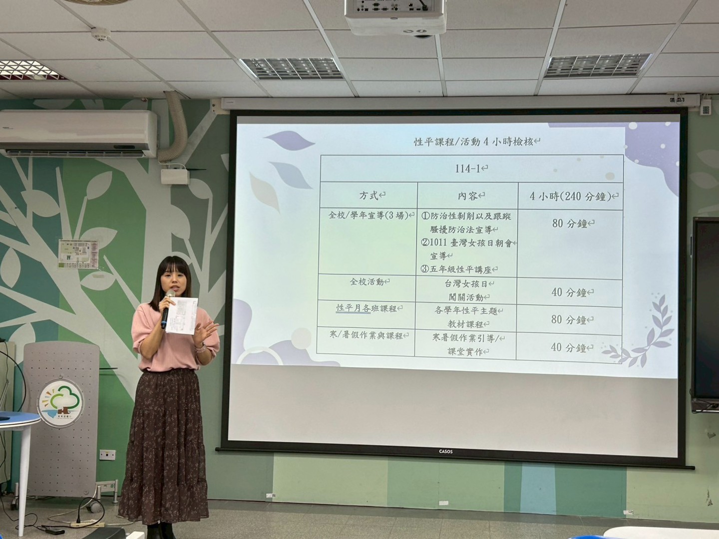 研習首先說明本校的性別平等教育校本課程架構,並帶領教師共同檢視本學期性平課程與活動的規畫安排。首先介紹各年級可運用之教學資源,包括性別刻板印象、身體界線、尊重差異、情緒教育等主題的繪本、影片,以及適齡的防治性剝削補充宣導教材,協助教師掌握不同年段的教學內容與重點。