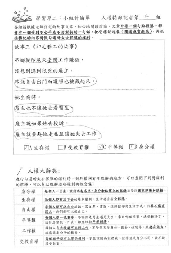 教學過程中,教學者透過影片欣賞、情境討論、學習單與小組分享,引導學生認識全球人口移動的原因,理解移民、移工及新住民在臺灣生活中所面臨的處境與人權議題。而學生也在討論中學習傾聽與表達,逐步培養尊重差異、同理他人的態度,課堂氣氛溫暖而投入。