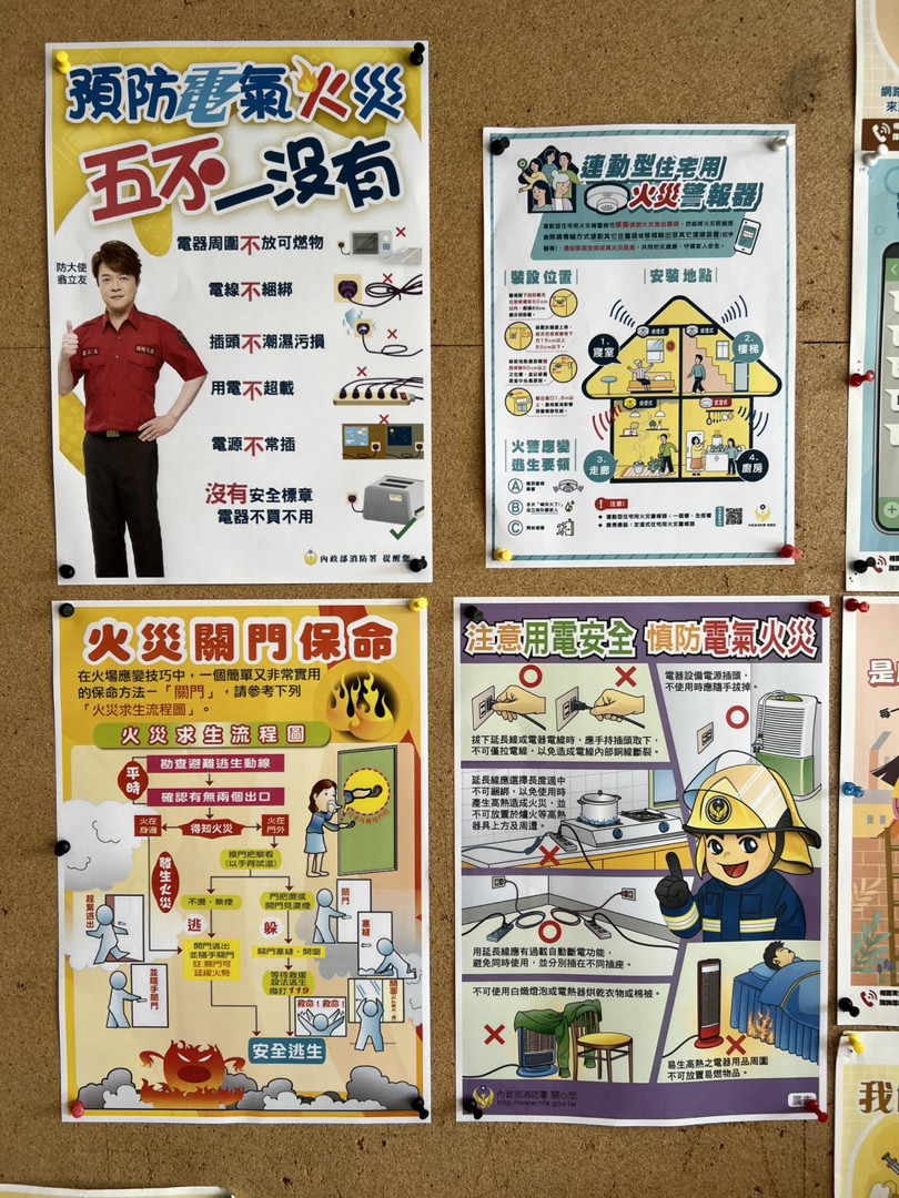 水源國小於公布欄張貼用電安全及火災發生時如何逃生等相關安全宣導海報。期待能提醒學生及家長們對火災危險因子的識別意識及降低住宅火災死亡與傷害事故發生率。