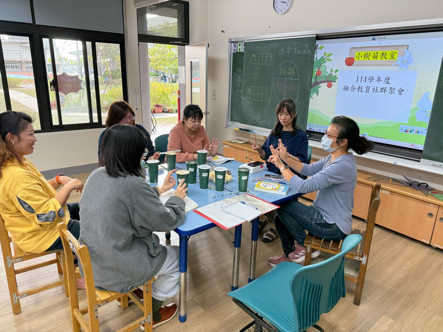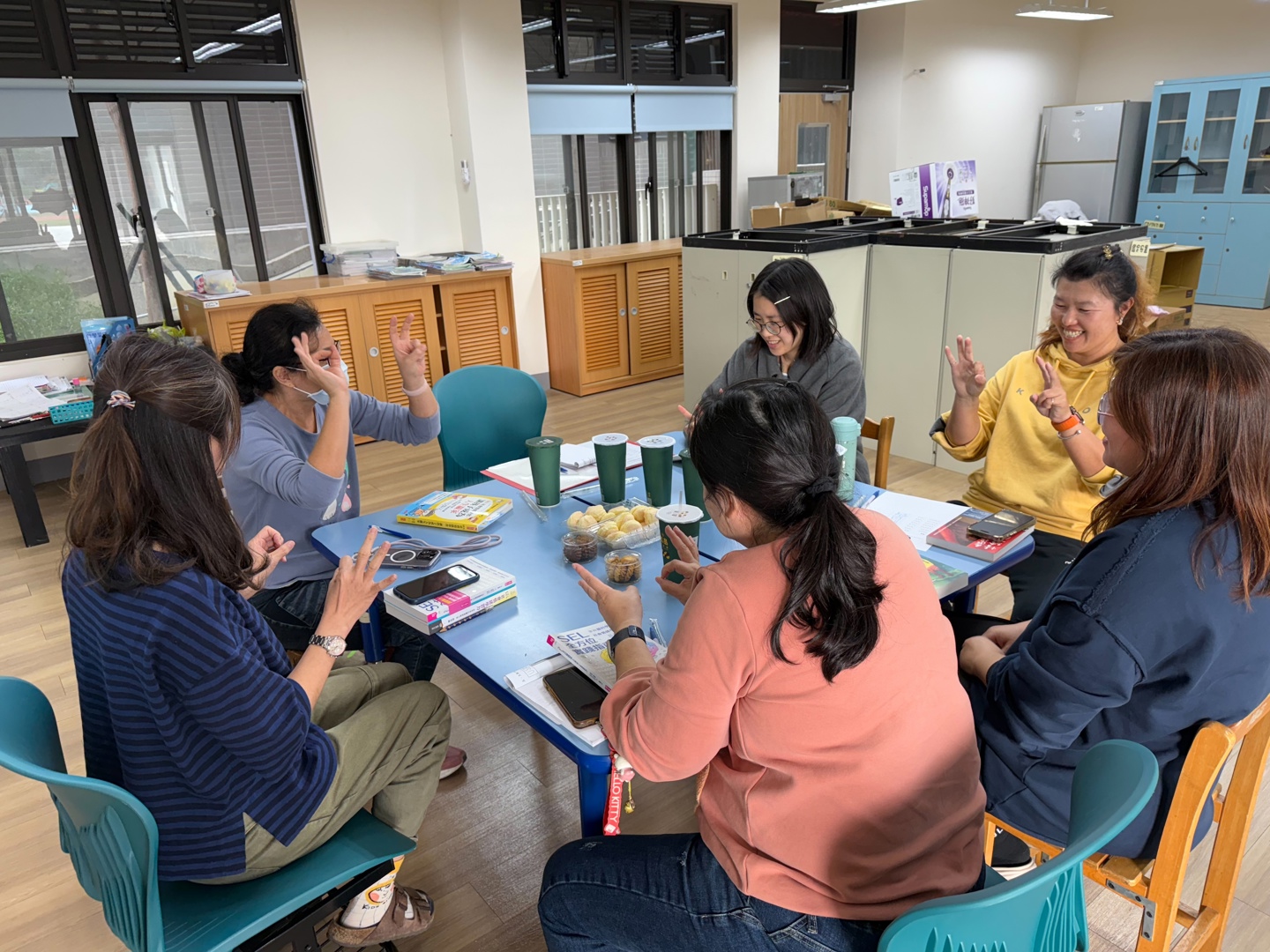 12/15為社群第三次聚會,特別邀請校內護理師加入,展現跨專業合作的精神。活動一開始由特教教師帶領進行「OK 與比耶」的小遊戲,透過簡單有趣的互動方式,讓教師親身體驗如何訓練孩子的專注力與自我控制,也分享此活動可靈活運用於課堂開始前,幫助學生快速進入學習狀態。