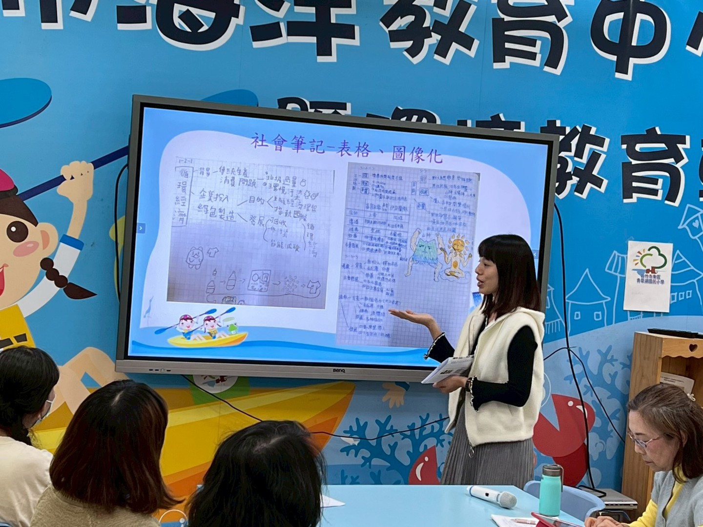 青草湖國小以高年級社會教學為主軸,將多元教學特色統整為「社會筆記」、「小組合作學習」、「融入科技載具」及「校外踏查」四大面向進行分享。隨著高年級社會領域課程知識性內容增加,教師運用心智圖、表格圖像化、六何法等學習策略,引導學生練習整理不同類型的資料,轉化為系統化的社會筆記,作為理解與複習的重要學習工具。