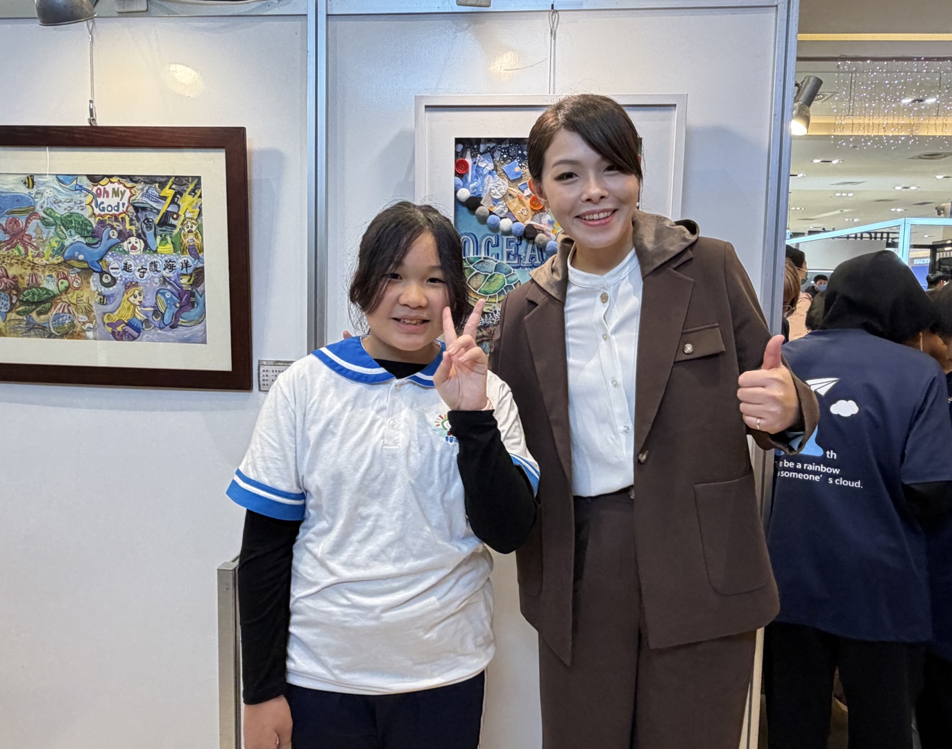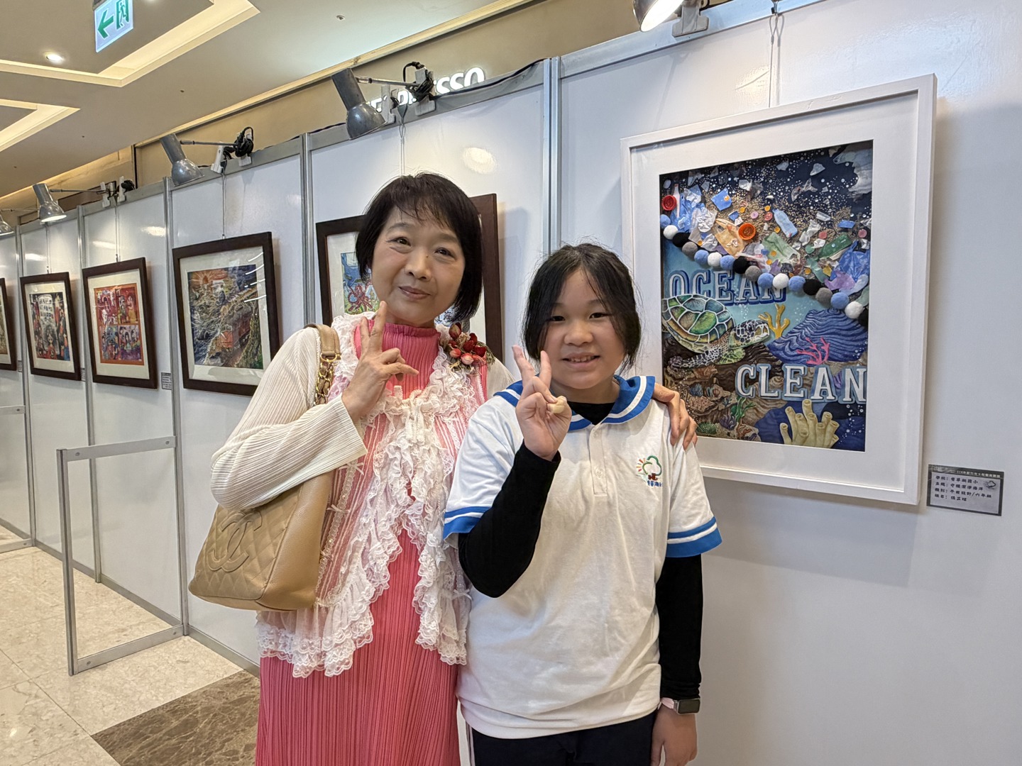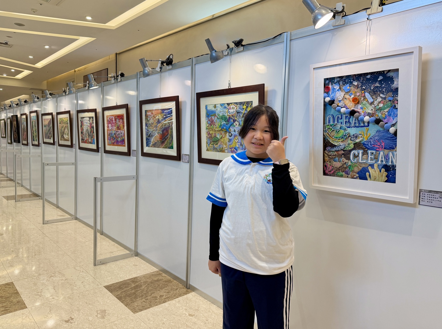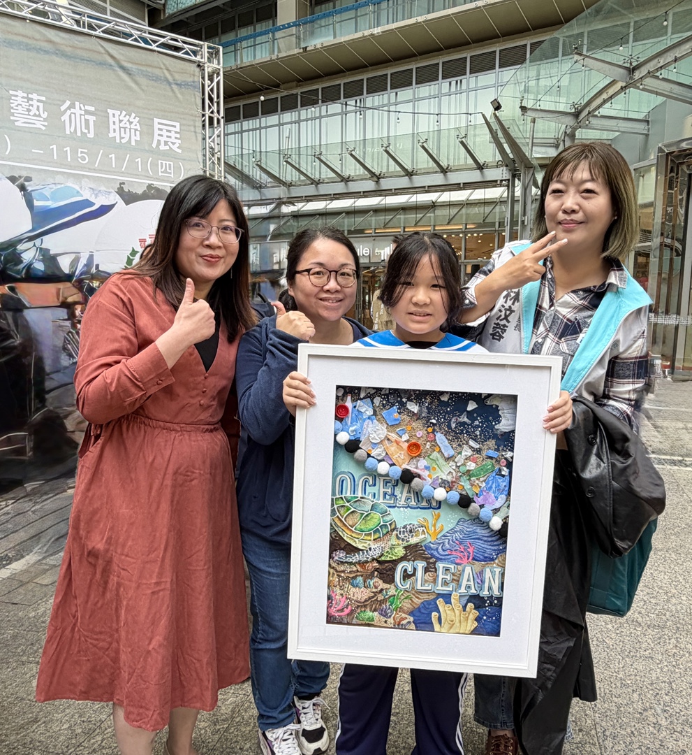 新竹市藝文界盛事—十校藝術聯展「拾藝之光」12/17於巨城盛大開幕。青草湖國小精選十件作品參展,由家玟主任、文祥老師協助佈展,張芷瑄同學代表出席,她的作品「守護潔淨海洋」與海洋環境保護議題相關,與市長及來賓介紹創作理念,獲得高度的肯定。