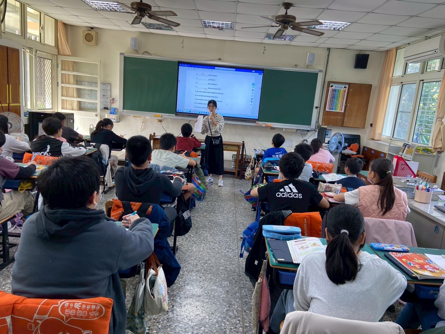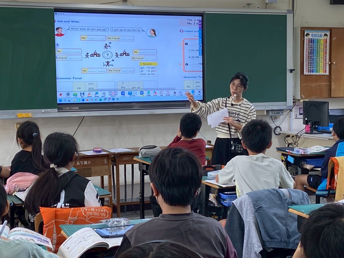 課堂開始前,老師一如往常地提醒孩子清理桌面,在簡單複習後,老師帶著孩子們練習了今天所要學的新句型,幾次示範和抽問之後,老師簡單解說學習單內容,學生們依照教師指示使用載具完成手上的學習單,能力更高者,則自動進入酷英平台提前完成教師派發的學生作業。