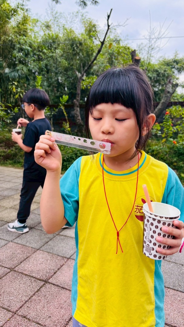 活動過程中,孩子們輪流使用吸管、毛根製作的泡泡棒、手指、剪刀與直尺,專注地吹出一顆顆閃閃發亮的泡泡。有人發現輕輕吹能讓泡泡更圓,也有人發現不同工具會讓泡泡變得又大又長。透過不斷嘗試與分享,孩子們在歡笑中學習觀察與比較。