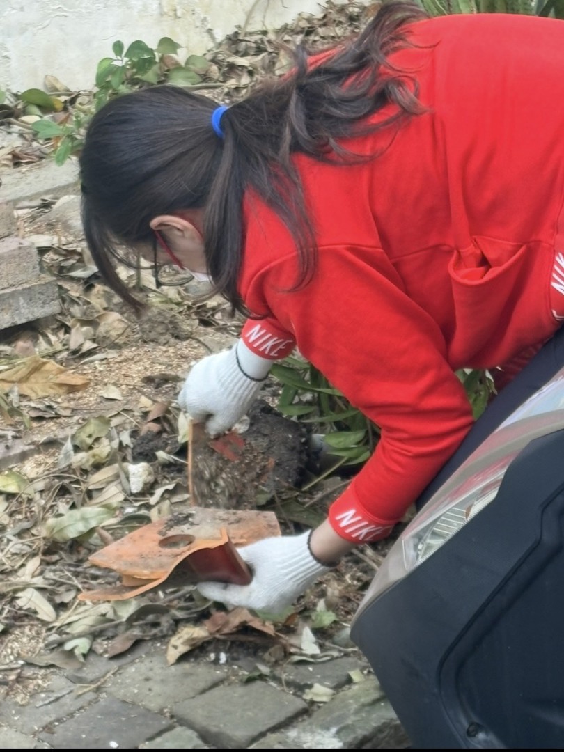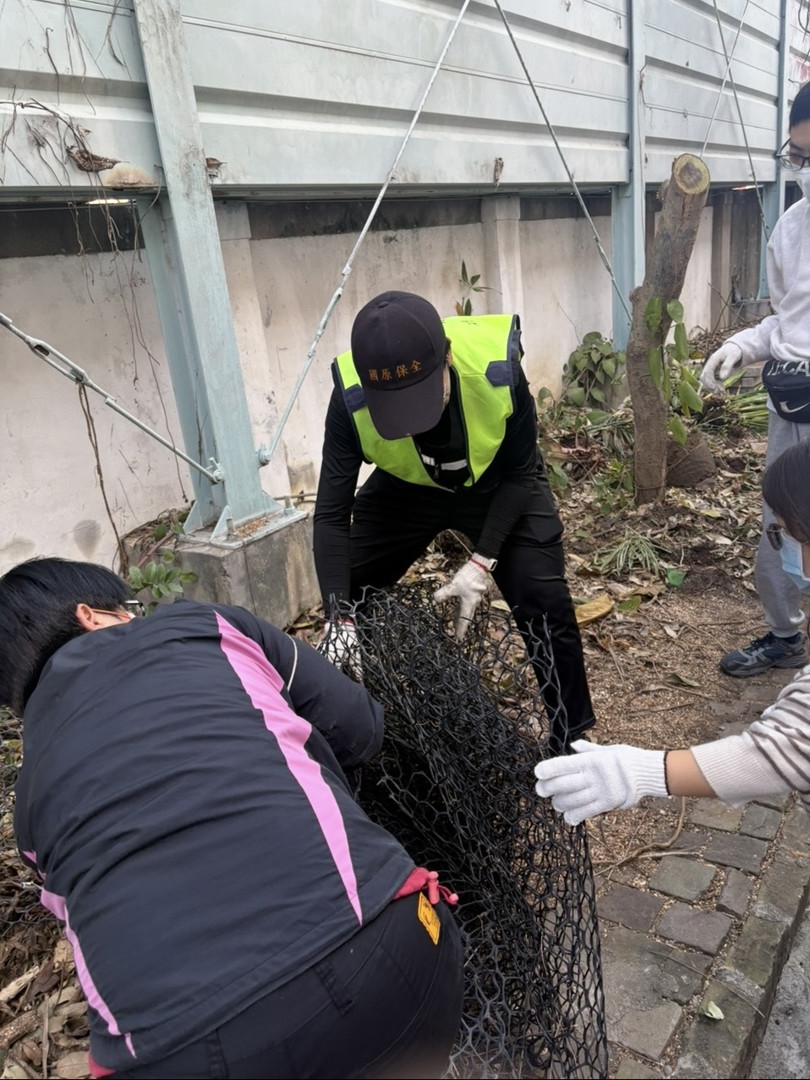 趁著明天平安夜東北季風再度增強並挾帶水氣南下迎來今年入冬後第二波冷氣團,今天上午各地天氣晴朗穩定,白天舒適微熱,一早本校最優質的總務處服務團隊在主任帶領下集合在經國路圍牆內側,整理圍牆邊雜亂的物品~~這真的是一件很麻煩的事~有棄置的盆栽也有數十年前設置的黑籬網,在總務主任的率領下大家七手八腳地把盆栽移開,漸漸地將雜亂的東西清好,堪用的盆子也移到後門去使用!整理過後,整個環境亮了起來~因為大家的通力合作讓民富校園更美麗~