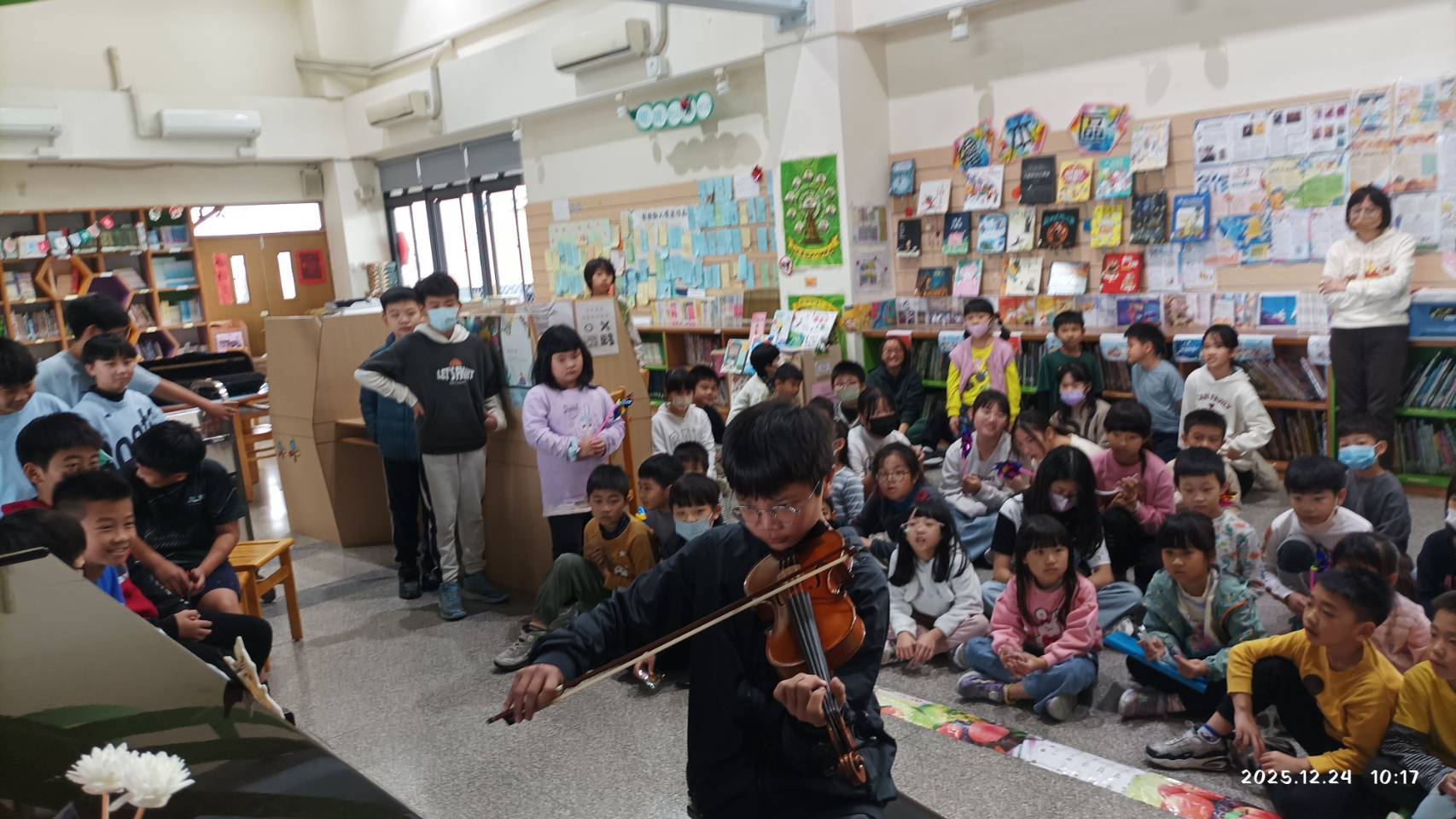 音樂會在守彤同學悠揚深情的二胡演奏《Deck the Halls》中揭開序幕。東方樂器詮釋西方聖誕名曲,別具巧思,弦音一出便吸引眾人駐足聆聽,為活動結合濃厚西洋節慶氣氛與中華文化的元素,也讓許多沒有聽過二胡演奏的低年級小朋友眼睛一亮。緊接著,就是六年愛班尚恩同學以小提琴登場,音色明亮流暢,展現長期練習累積的實力,悠揚的樂聲不僅讓神奇書屋更添優雅氣質,也讓現場掌聲不斷。