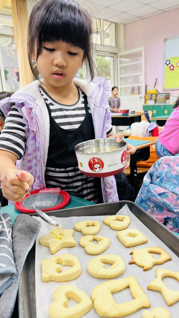 活動開始前,老師先說明製作流程、工具使用方式及基本衛生與安全觀念,引導孩子們有序進行。實作過程中,孩子們彼此提醒步驟、互相鼓勵,展現良好的學習互動。各式聖誕造型的餅乾逐一完成,也讓孩子在觀察與嘗試中體會細心與耐心的重要。