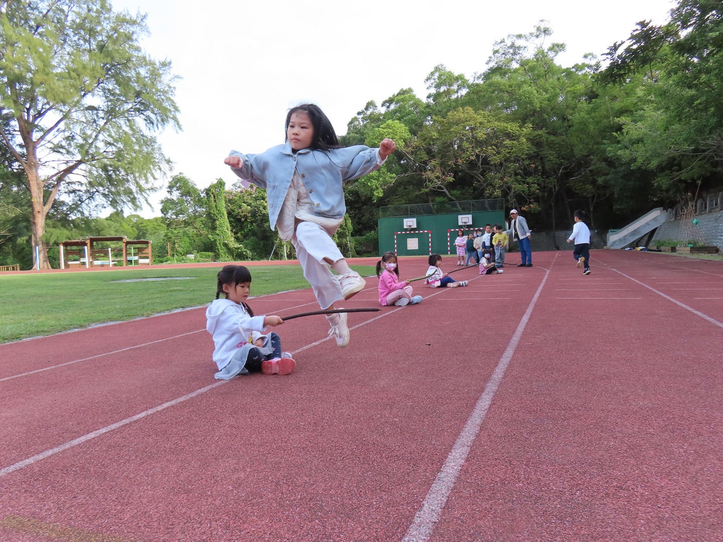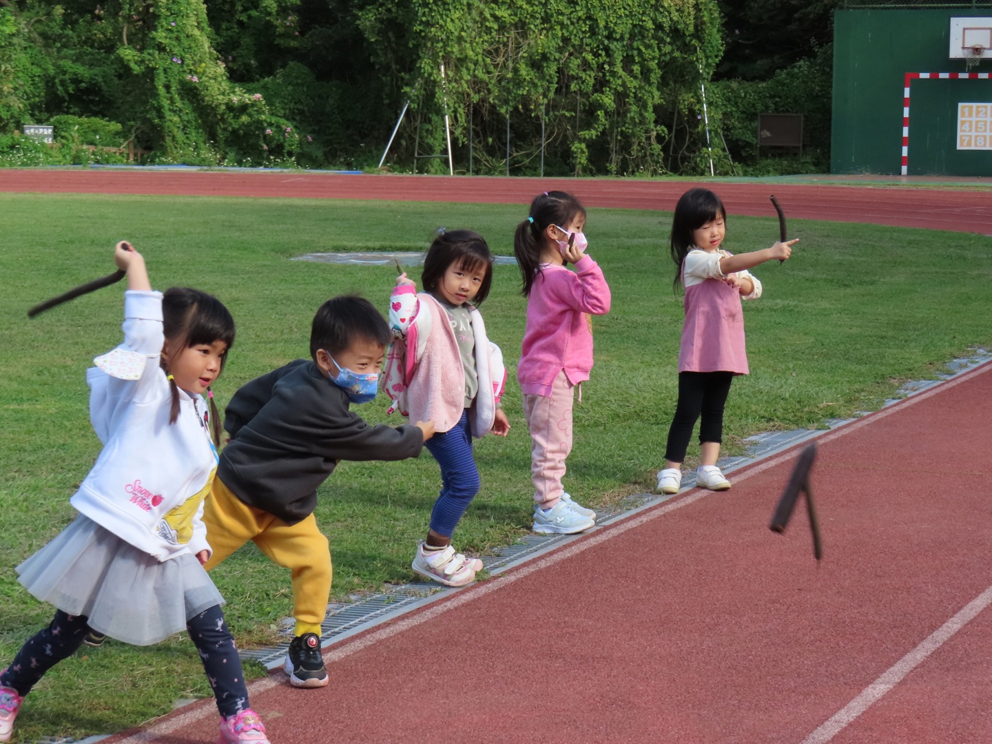 並結合大肌肉出汗運動進行種子傳播的肢體想像創作,也邀請阿勃勒果實一起玩,孩子們把阿勃勒果實高舉投擲嘗試把它投進籃框、把它當成飛鏢看誰丟得遠、當成跨欄架玩跨欄…