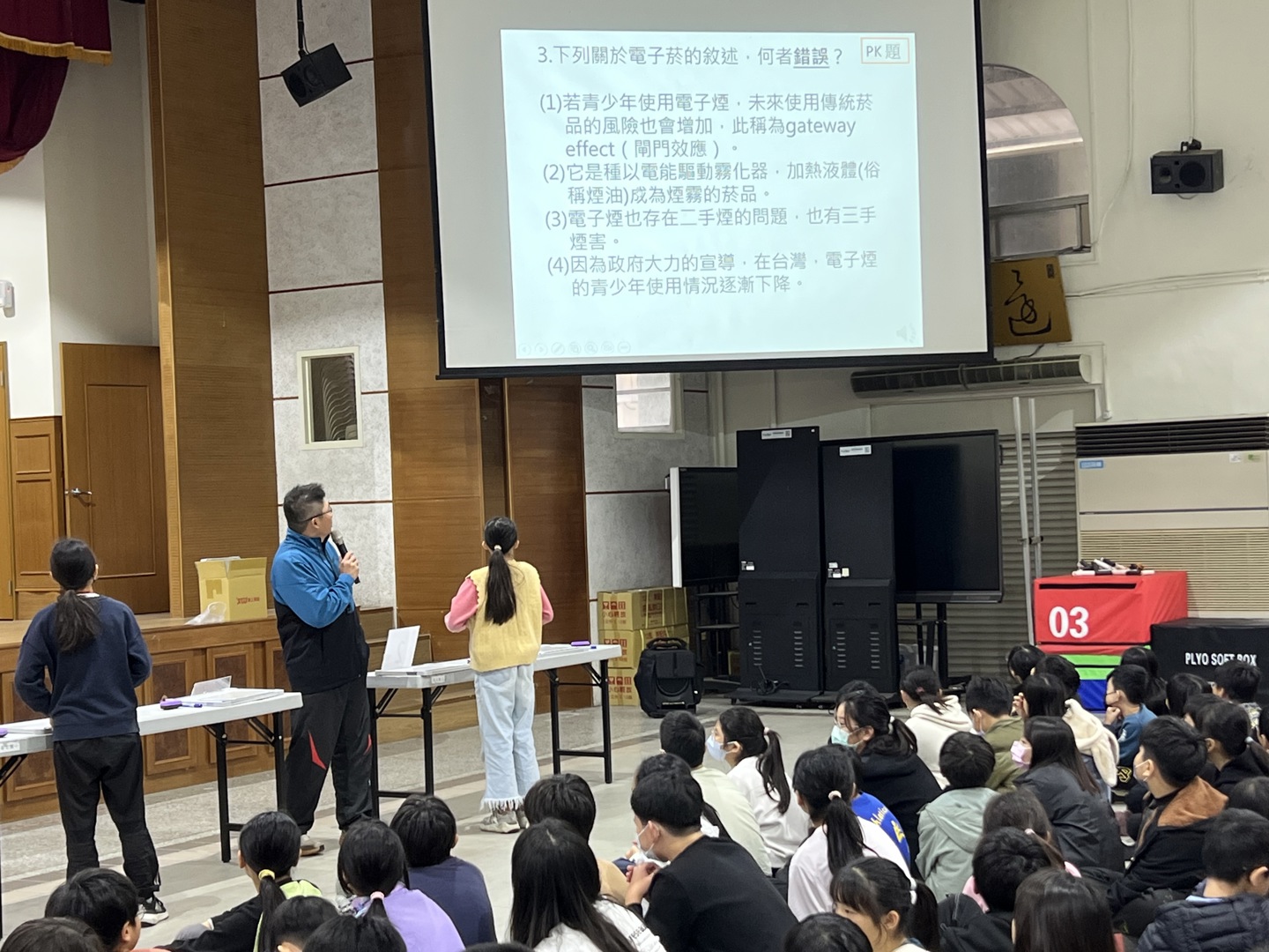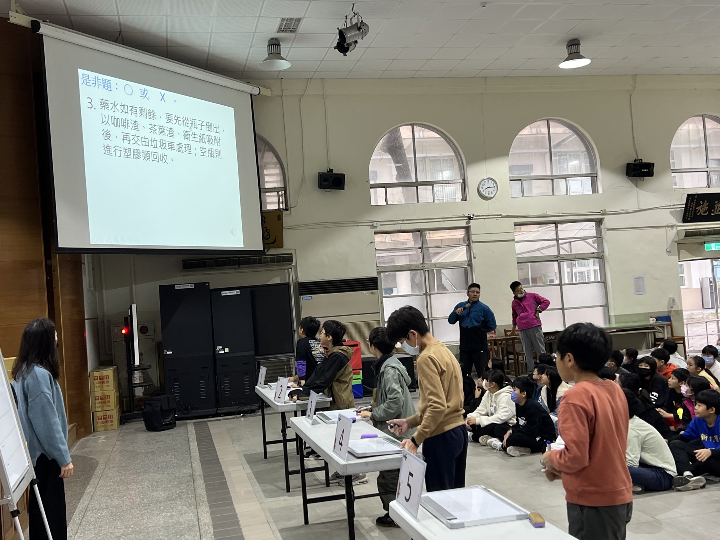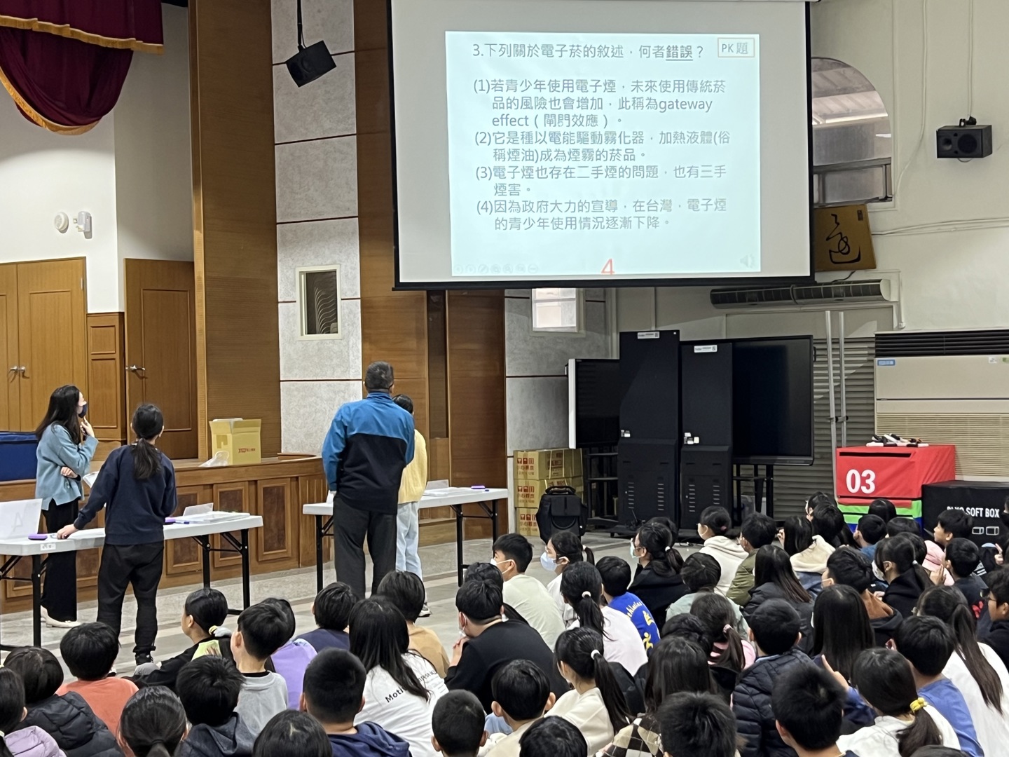 今天上午的週會時間在禮堂進行的是六年級「法律常識擂臺賽」,六年級8個班級參加。活動過程中,不僅考驗學生的法律知識,亦融入健康促進議題,提供學生認識飲酒駕車、毒品危害等相關法律知識,並宣導拒絕暴力與反霸凌的重要性。期望學生透過比賽了解校園及社會中可能遇到的法律問題,並意識到身心健康的重要性。