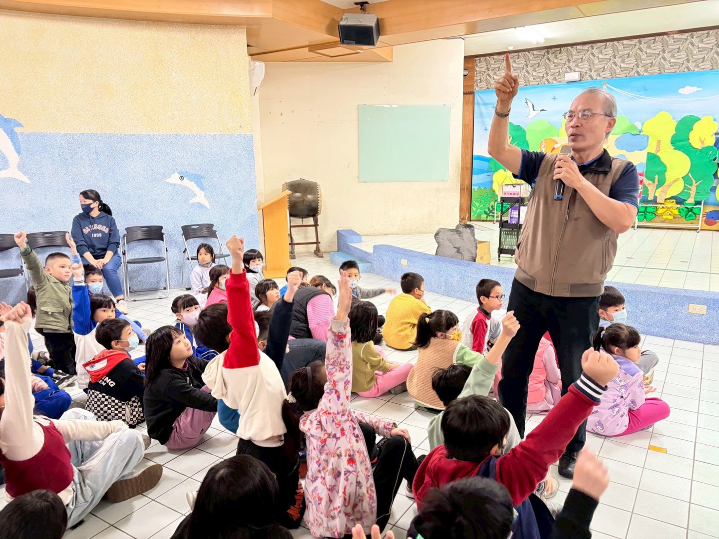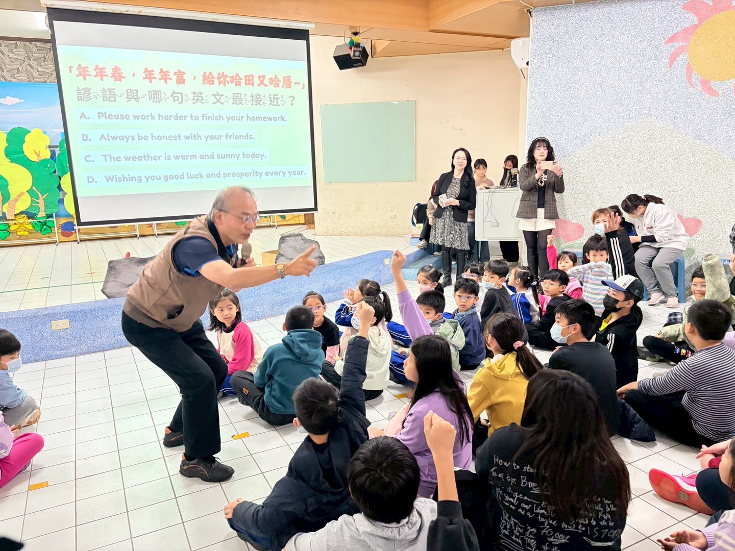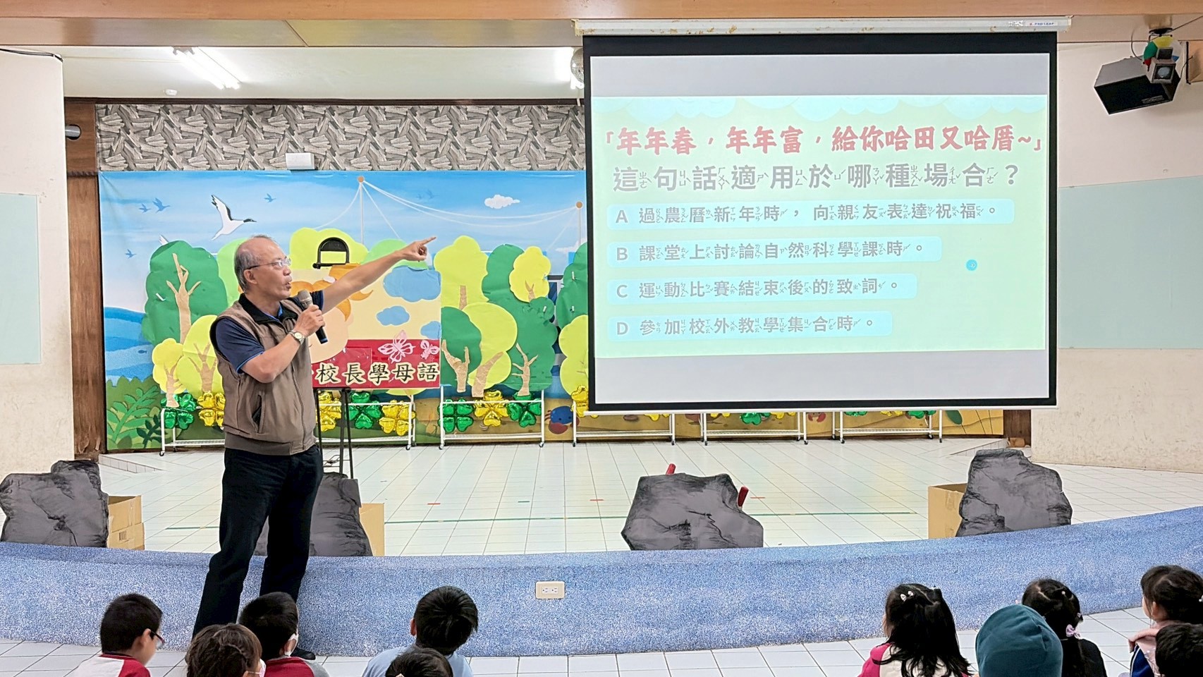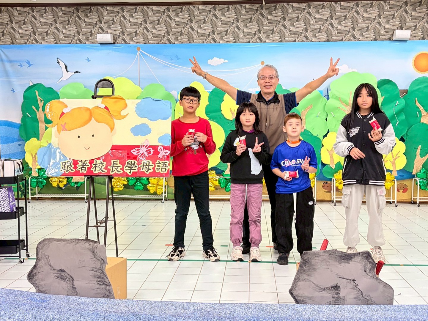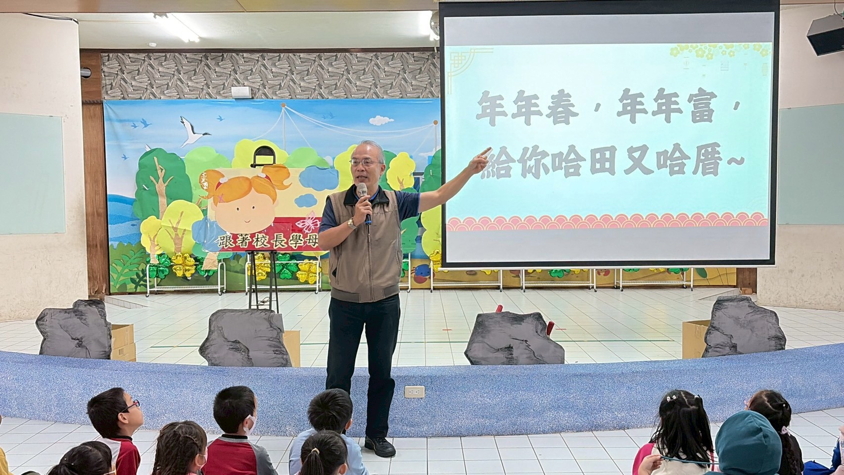 為推動本土語教育並深化多語言學習內涵,本校特別辦理「跟著校長學母語」活動,在展演廳進行全校性活動。活動由校長親自帶領,結合母語與英語教學,讓全體師生在溫馨熱鬧的氛圍中,一同感受語言學習與新春祝福的美好。