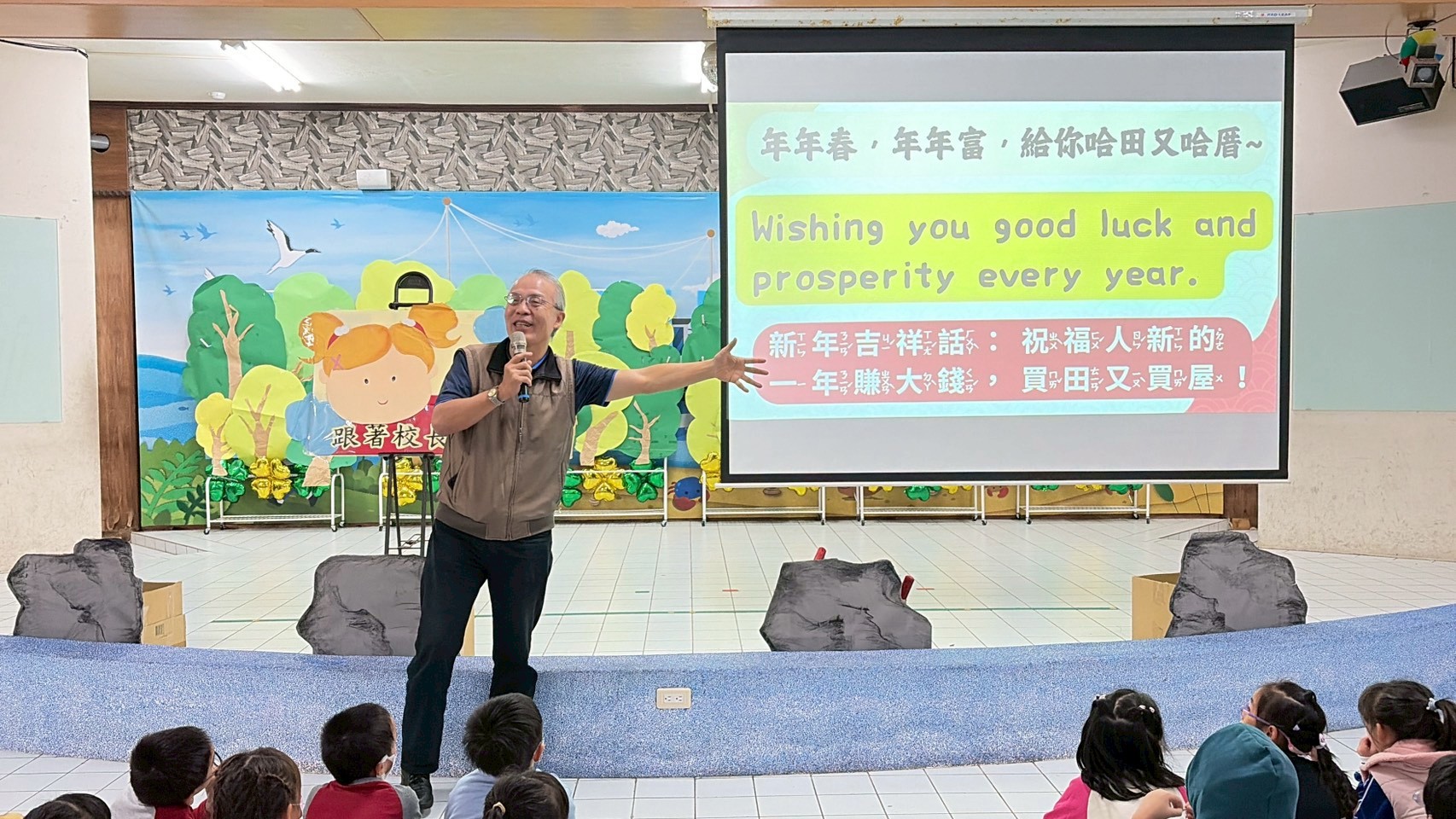 本次活動主題為「年年春,年年富,給你哈田又哈厝」,校長以生活化、生動的方式,引導學生認識母語中蘊含的祝福語與文化意涵,並帶領全校師生齊聲朗誦。同時,校長也向學生介紹英語祝福語 “Wishing you good luck and prosperity every year.”,說明其與母語祝賀詞相同的祝福精神,讓孩子了解不同語言雖表達方式不同,所傳遞的祝福與情感卻是一致的。