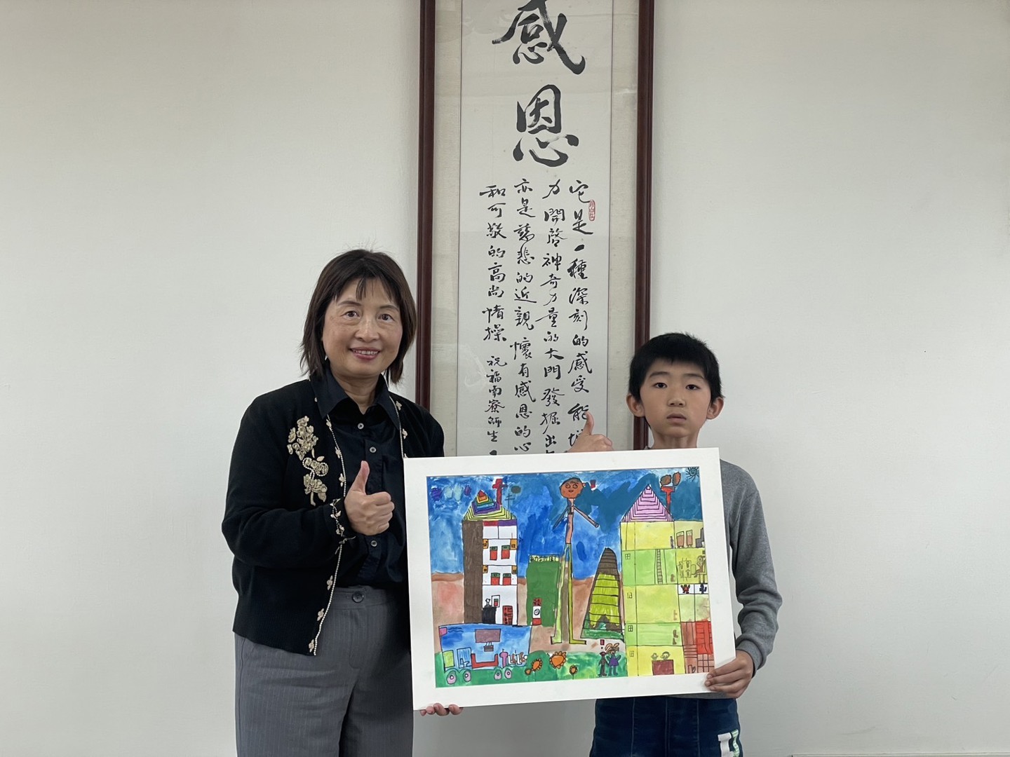 時隔兩載,作品回到台灣,並與校長合影,共同見證南寮有愛團隊發掘學生多元天賦的成果。