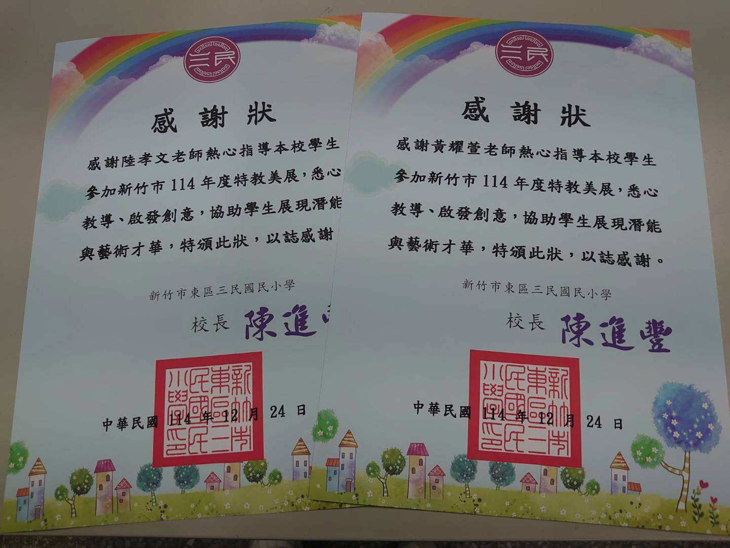 114年度特殊教育學生美術比賽指導老師頒發獎狀和獎勵金及感謝狀
