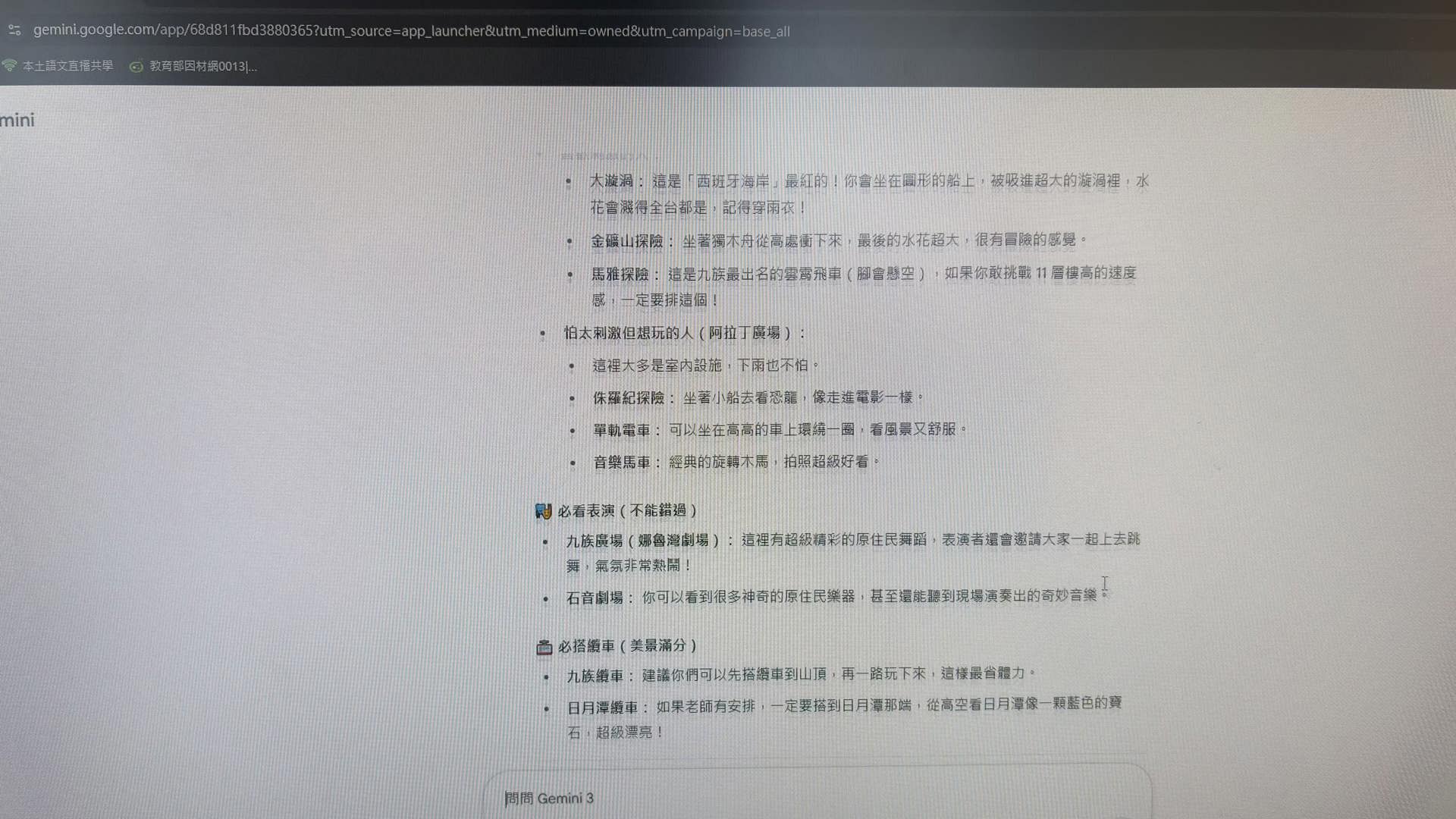 學生學習運用「提示詞結構」將腦中的想法條理化。例如今天使用了「導覽圖」生成的提示詞,協助在參觀樂園前,能夠有一些對遊樂園的背景知識,讓旅程更為有趣。我們發現,當孩子能清楚地說出人、事、時、地、物,以及目的或用途等,AI才能成為精準的助手。這證明了「清晰的邏輯與文字的溝通,才是讓AI好用的關鍵」。