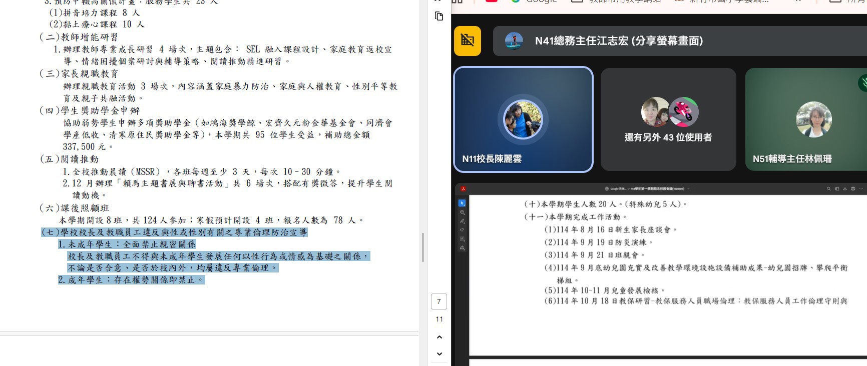 新竹市內湖國小於 115 年 1 月 7 日 期末校務會議中,由輔導室主任針對全校教職員工辦理「校長及教職員工違反與性或性別有關之專業倫理防治宣導」。宣導內容依據《性別平等教育法》,說明校長及教職員工與學生互動應嚴守專業界線之相關規範,包含未成年學生全面禁止發展性或情感關係,成年學生於具權勢不對等關係下亦不得發展親密關係,並強調避免私下頻繁聯繫、單獨互動及特殊對待等行為,若有違反專業倫理之虞,應主動迴避並依校內通報機制處理,以落實校園性別事件預防,營造安全友善之校園環境。